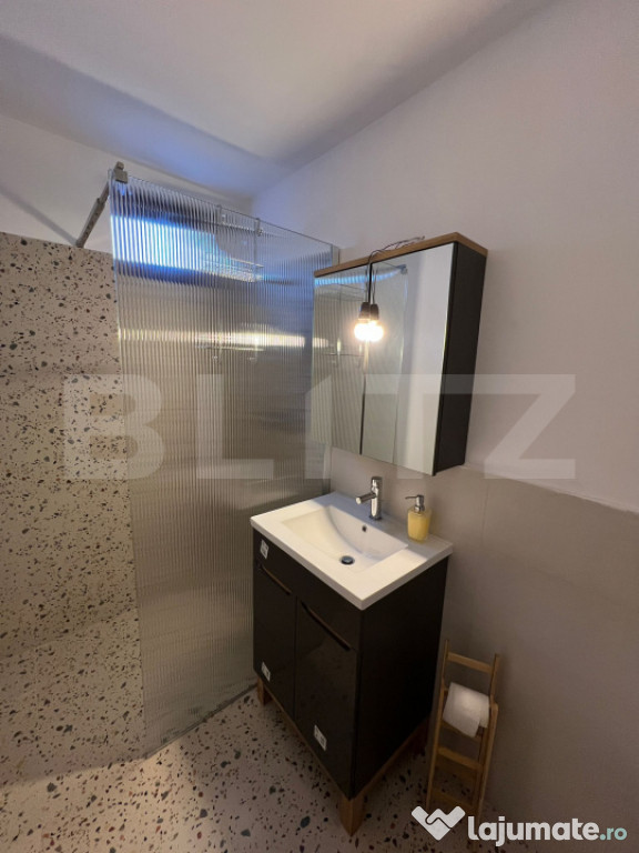 Blitz va ofera spre inchiriere o casa recent renovata, formata din dormitor, living open space cu bucataria, baie si o curte, 43 mp. Casa beneficiaza de centrala proprie, incalzirea este prin pardoseala, boiler si un loc de parcare. Este disponibila imediat.Va asteptam cu drag la vizionare!