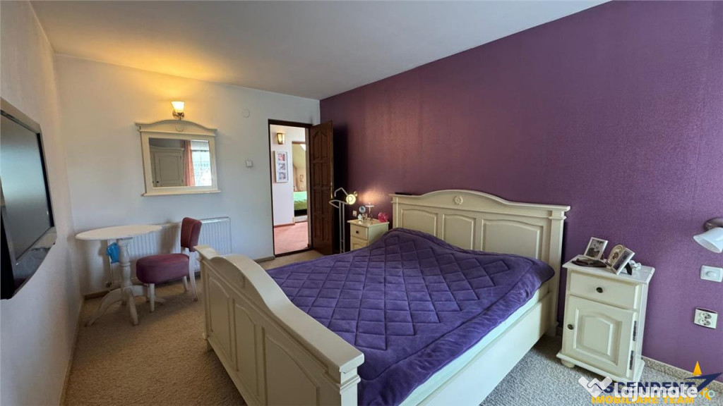 Scara interioara, sculptata din lemn masiv, ofera o trecere fluida si rafinata catre etaj, unde se afla trei dormitoare spatioase. Fiecare camera este gandita pentru a oferi liniste, odihna si intimitate, intr-un cadru cald si primitor. Baia de la etaj, decorata cu gust si complet echipata, contribuie la senzatia de relaxare si confort.