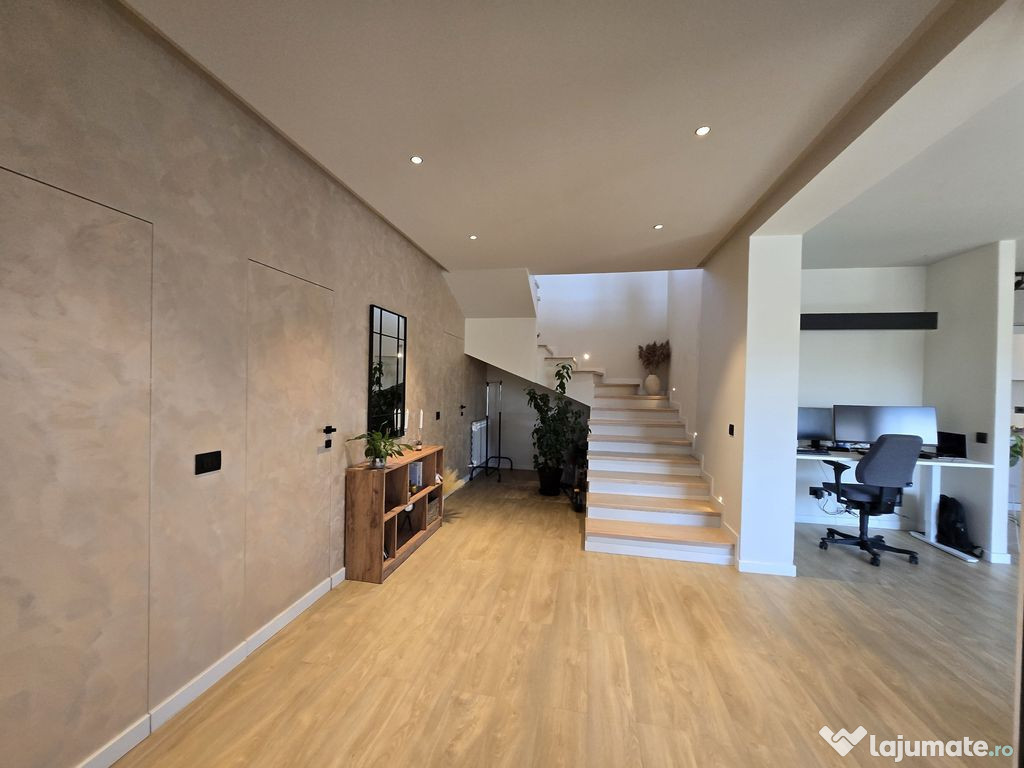 Iluminat controlat prin telefon sau telecomanda, rulouri exterioare cu control prin telecomanda, incalzire centralizata si centrala pe gaz - solutie care permite recompartimentarea casei functie de necesitatile noului proprietar --- sunt cateva dintre dotarile actuale ale casei.