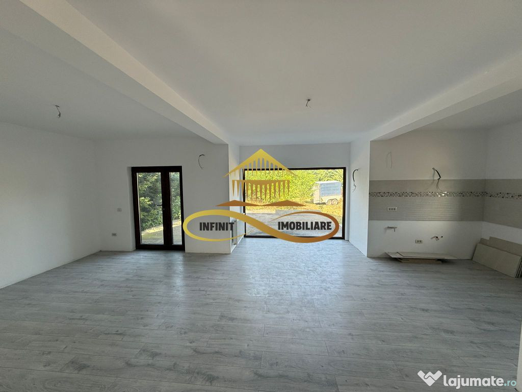 Living luminos cu bucatarie open space, cu vedere catre curte.