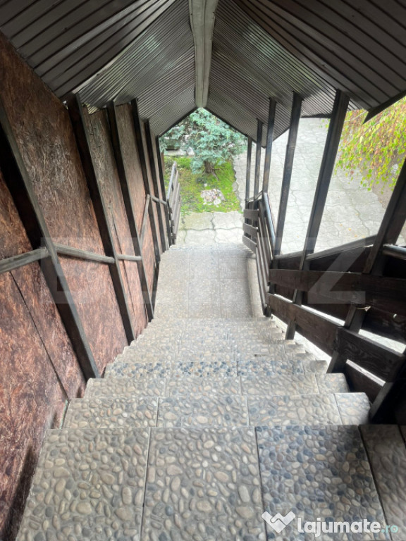Accesul la etaj se face printr-o scară exterioară, ceea ce oferă și posibilitatea utilizării celor două niveluri ca unități separate oferind intimitate (de exemplu, locuit și închiriere).