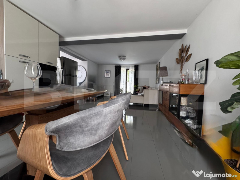 Blitz va propune spre vanzare o casa P+1 , parte dintr-un duplex finalizat in 2017, 201 mp teren, zona Damila.Se vinde complet mobilată și utilată, situată într-o zonă liniștită, ideală pentru locuință permanentă sau casă de vacanță. Proprietatea dispune de două surse de încălzire, centrală electrică și șemineu pe peleți, oferind confort pe tot parcursul anului. La parter se află un living open space cu bucătărie și ieșire în curtea din spate, iar baia este amplasată pe partea stângă a holului. La etaj se găsesc două dormitoare și o baie, spațiile fiind bine compartimentate și luminoase. Construcția este realizată din cărămidă și acoperită cu tablă Lindab, având o suprafață utilă de aproximativ 90 mp. Curtea este amenajată atât în față, cât și în spate, oferind un spațiu plăcut pentru relaxare. Ca si utilități, casa dispune de apă și curent electric, fosă septică, iar gazele și canalizarea se află la aproximativ 200 de metri, pe strada principală. Imobilul se vinde complet mobilat și utilat, fiind gata pentru mutare imediată. Pentru mai multe detalii, va asteptam la vizionare!