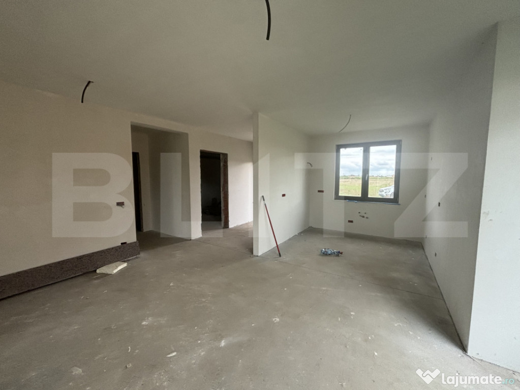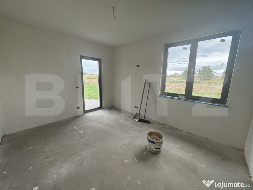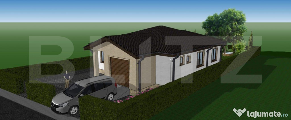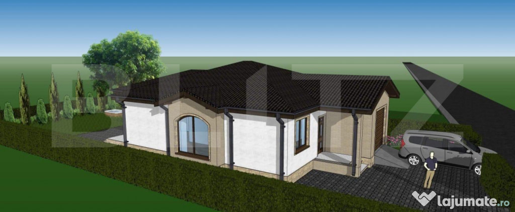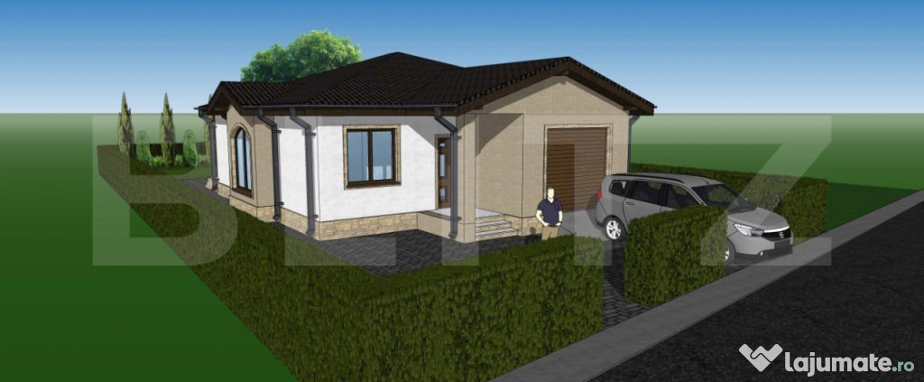 • Casa se predă cu gard finalizat, finisaje exterioare complete și interior semifinisat, lăsând libertatea viitorului proprietar să personalizeze designul după propriile gusturi.