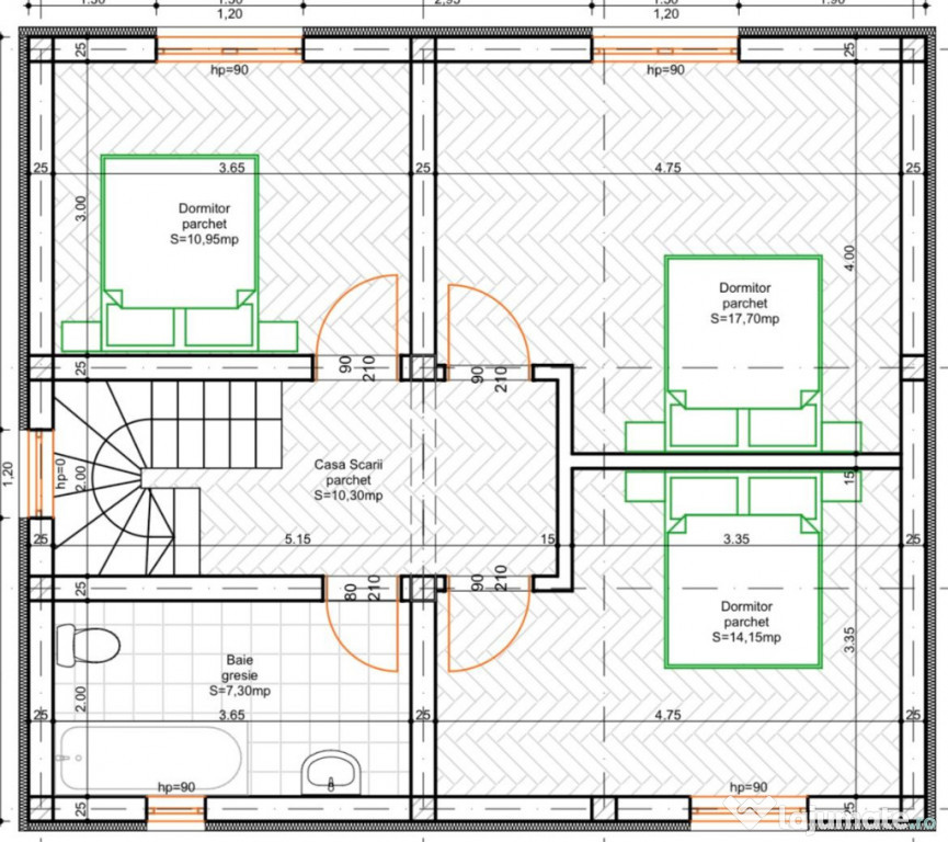 - trei dormitoare, baie, hol;