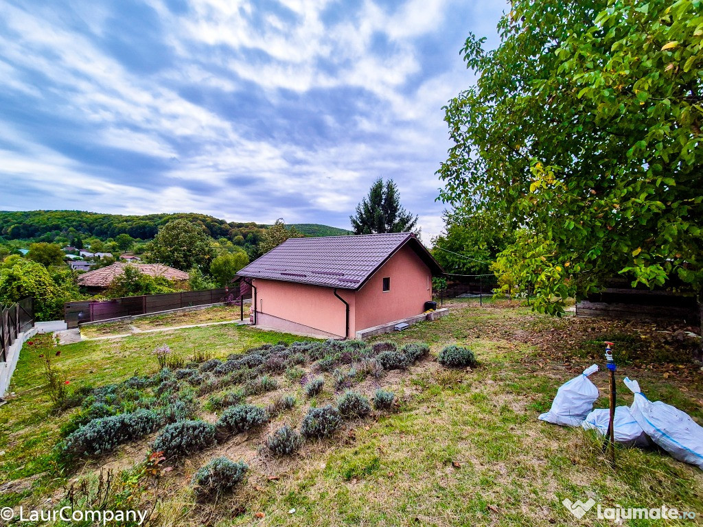 Va prezentam spre vanzare o proprietate bine pozitionata intr o zona de deal si padure situata in Valea Mare Podgoria Stefanesti , judet Arges , compusa din casa si teren intravilan . Casa construita in anul 2018 pe structura din lemn avand suprafata de 50 mp , living , dormitor , bucatarie , hol , pod functional , terasa , centrala termica , boiler , tamplarie lemn stratificat utilata - mobilata .Proprietate beneficiiaza de o suprafata de 2647 mp teren intravilan cu 2 deschideri : 18 m respectiv 50 m , toate utilitatile : apa , gaze , curent , canalizare , asfalt curte ingradita , bine pozitionata intr un decor de poveste .