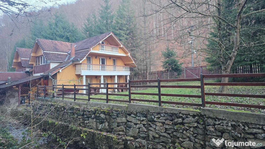 Constructia se regaseste in localitatea Bratca pe Valea Bratcutei in Judetul Bihor, localitatea turistica consacrata inconjurata de peisaje muntoase spectaculoase, multa verdeata, paduri dese, parau care trece exact prin proprietate fiind o alegere inspirata pentru casa de vacanta, pensiune, proprietate complet mobilata, functionala, ideala pentru turism. Suprafetele generoase ale imobilului si compartimentarea inspirata permit functionarea ca pensiune, de altfel doua pensiuni fiecare fiind independenta din punct de vedere (cadastral al documentelor de proprietate )si functional dar aparent a unui singur imobil, o singura cladire cu doua intrari separate, doua terenuri separate dar functionale din prisma utilitatilor (energie electrica, centrala pentru asigurarea apei calde si a caldurii, alimentari cu apa ,utilizari, mobilarii si utilarii independente una fata de cealalta).