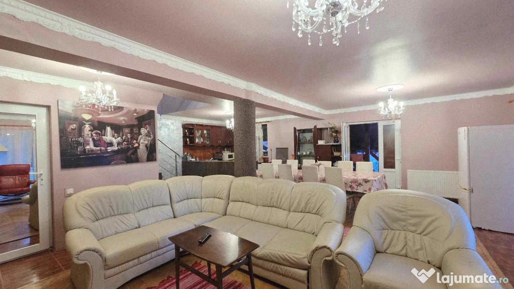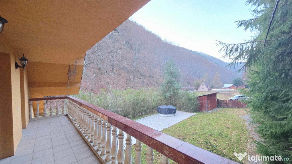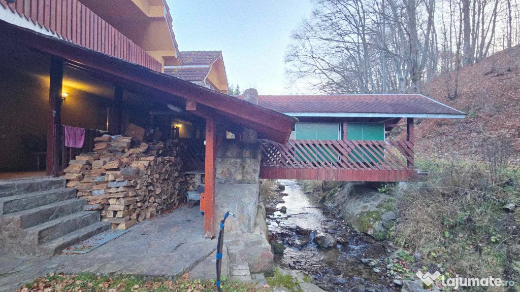 Proprietatea este compusa din doua cladiri identice ca compartimentare, cu suprafete si dotari generoase, teren 600+600,defalcate cadastral suprafata totala 1200 mp, doua corpuri de proprietate unite intre ele pe care in descrierea urmatoare le vom denumi corpul 1 si corpul 2 cu suprafete de 170 mp respectiv 200 mp, suprafata totala 370 mp, constructie relativ noua construita cu simt de raspundere, caramida, izolatie exterioara si multe altele. Filigorie din lemn masiv care uneste cele doua intrari ale corpurilor 1 si 2 in spatiu comun si care se extinde de la nivelul cladirilor pana peste paraul care traverseaza proprietatea, completand momentele de relaxare si intarind cadrul mirific pe care se afla proprietatea si panorama acestei proprietati.