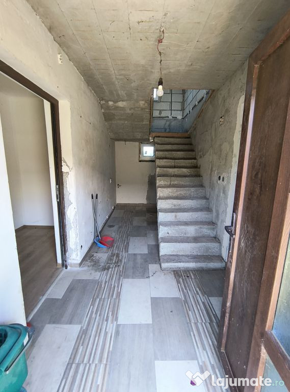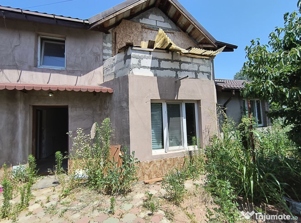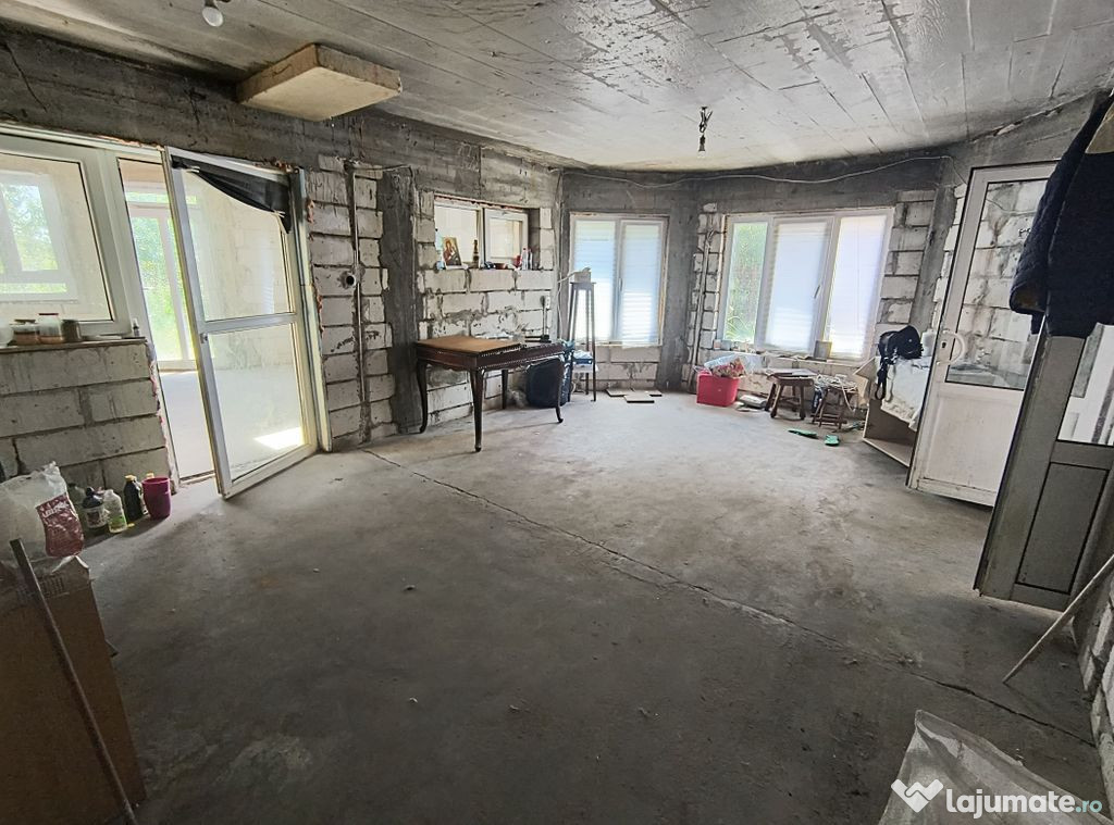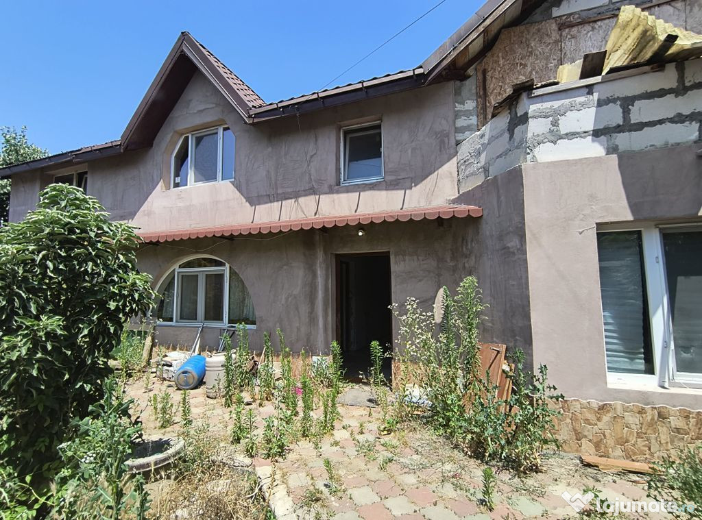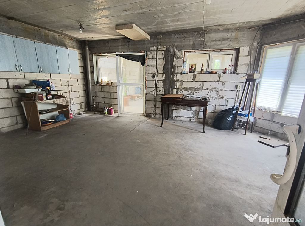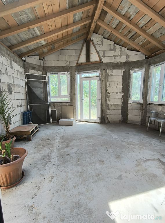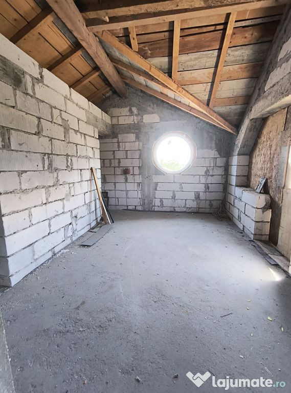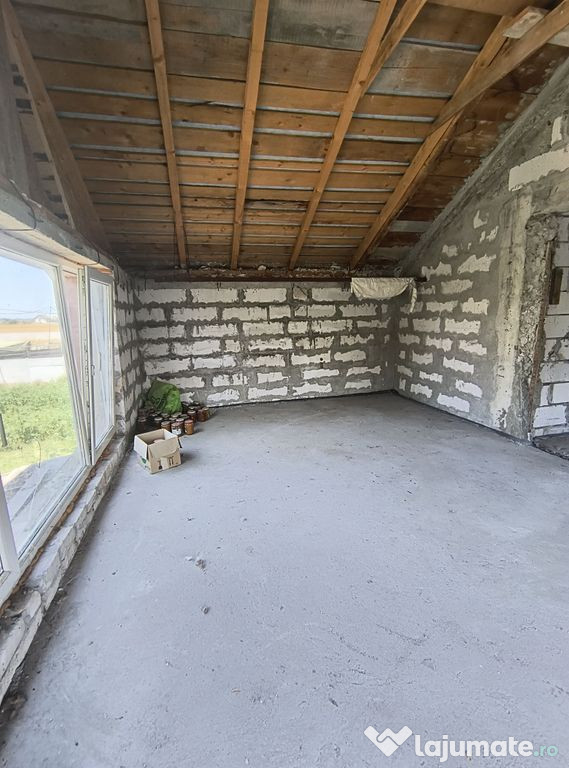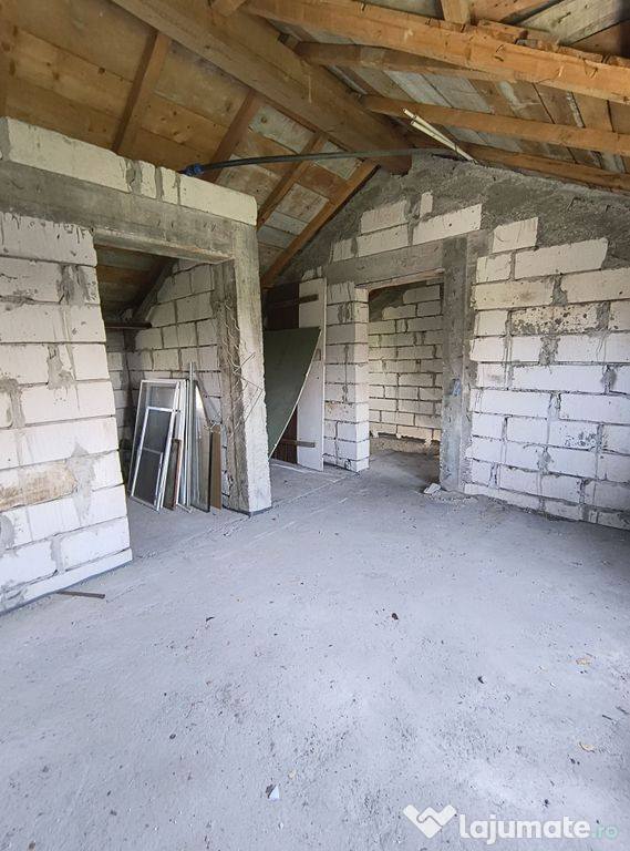 Va propunem spre vanzare o casa compusa din P+M, neterminata, 121 mp utili, 160 desfasurati, teren 1012, curte libera 891, utilitati: lumina, fosa, put, gaze la poarta, toate actele. Se vinde asa cum este in poze si cum se vede la vizionare.Comision Vanzare 3% +TVA
