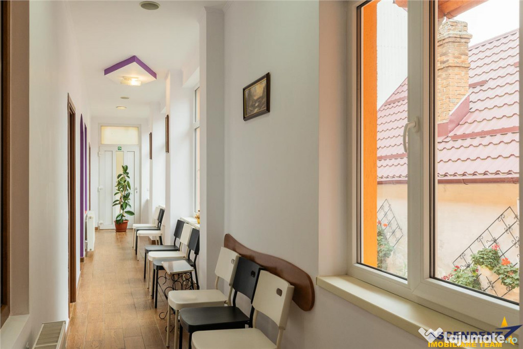 - prima parte este transformata intr-un spatiu cu 14 incaperi, receptie si grup sanitar pretabila pentru un salon de cosmetica, clinica, sediu de firma, restaurant, activitati cu copii, etc.