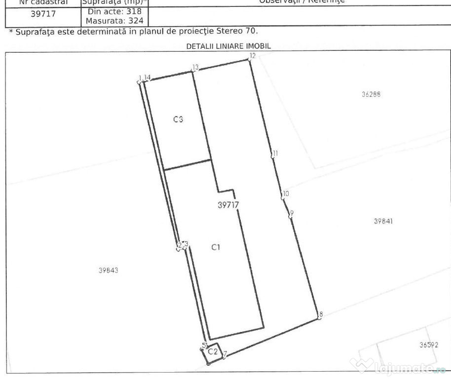 Terenul este intravilan, în suprafață de 318 mp (din acte), 324 mp (din masuratori), categoria de folosinta "curți construcții", tarla 51, parcela 15, forma neregulata, plat, deschidere cca. 12 m (estimare).Terenul are gard si poarta metalica la strada (poarta de acces), in stare fizica satisfacatoare. Nu a fost furnizat un Plan cadastral si nici un Certificat de urbanism.Constructie C1 Casa de locuit, suprafata construita de 101 mp, suprafata construita desfasurata de 101 mp, regim de inaltime parter, cu patru camere, din caramida, cu finisaje exterioare in stare relativ buna (tencuiala si zugraveala), sarpanta din lemn acoperita cu tigla, an construire 1964.Constructie C2 Anexa WC, suprafata construita de 3 mp, suprafata construita desfasurata de 3 mp, regim de inaltime parter, din boltari, cu finisaje inferioare, acoperita cu placa din beton, an construire 1964.Constructie C3 Anexa magazie, suprafata construita de 46 mp, suprafata construita desfasurata de 46 mp, regim de inaltime parter, din boltari, cu finisaje inferioare, acoperita cu tigla si tabla, an construire 1964.Nu a fost posibila inspectia la interiorul casei. Inspectia s-a efectuat la exteriorul
