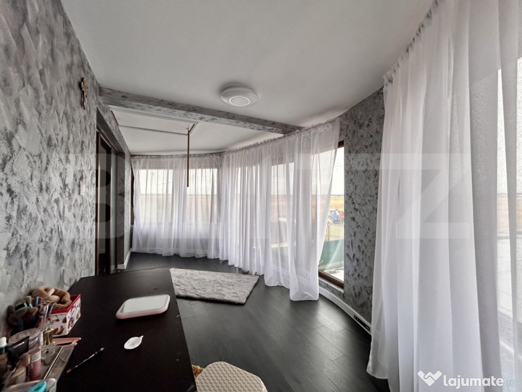 Casa se află într-o zonă aerisită, cu vedere liberă în față către câmp, oferind intimitate și liniște.