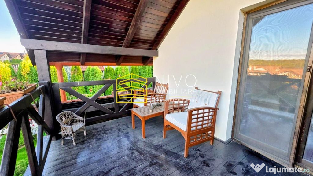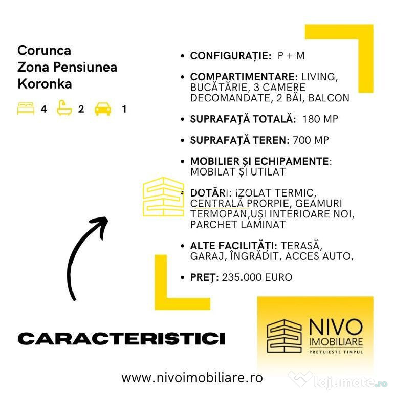 Casa este dispusă pe două niveluri (P+M), are o suprafață utilă de 180 mp și este compusă din living, bucătărie, 3 camere decomandate, 2 băi, balcon și 2 terase.