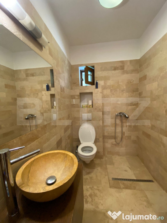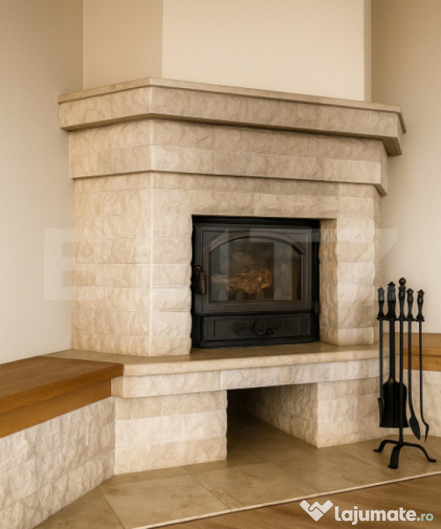 -Încălzire prin centrală pe gaz (nouă), completată de un șemineu funcțional.