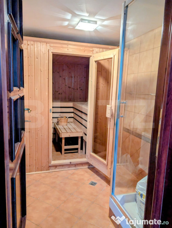 Aceasta este plasata pe un teren terasat (1000 mp) inconjurat de lemn din caramida, cu foisor, fantana arteziana si gradina cocheta. Exista posibilitatea de constructie a unui alt imobil, sau teren de sport pe terasa superioara a parcelei. Construit in 2010 din caramida (cu pereti grosi de cca. 40-50 cm), cu termopane din lemn (triplu stratificate), mobila din lemn masiv, parchet din lemn de stejar, granit si marmura de cea mai inalta calitate, cu numeroase terase si balcoane, imobilul este un simbol al bunului gust, situat intr-o zona linistita din in Bucium.