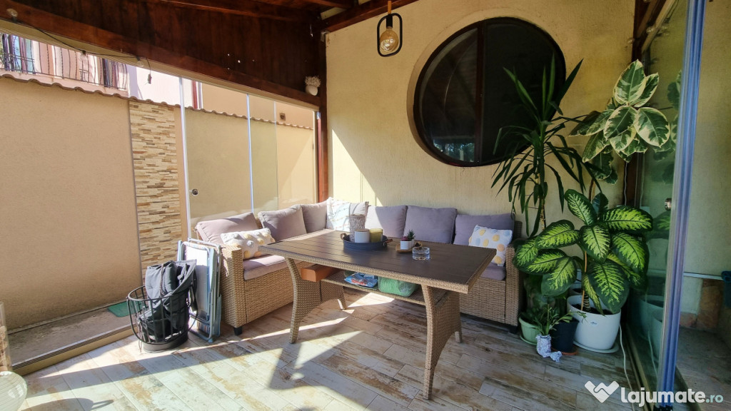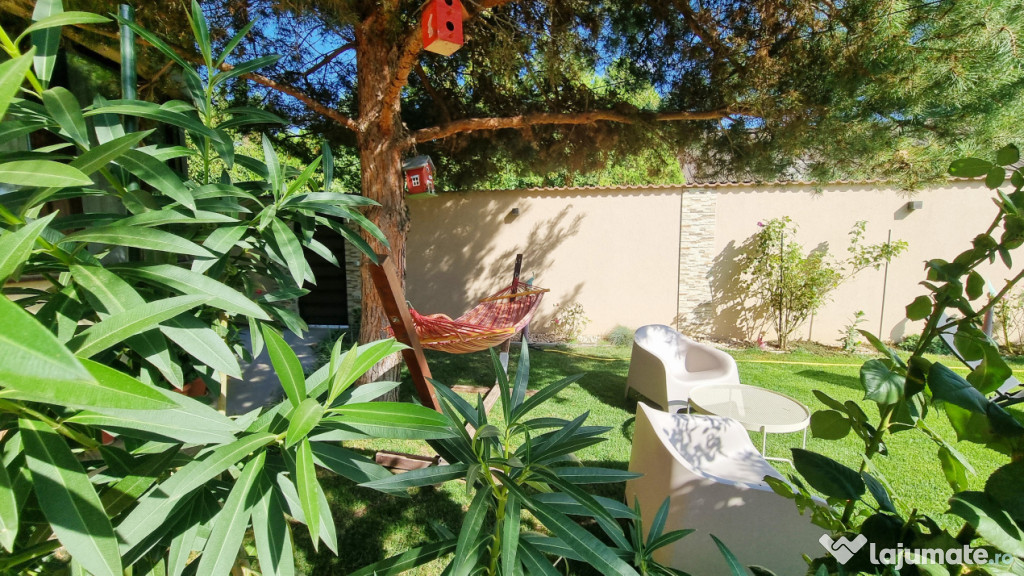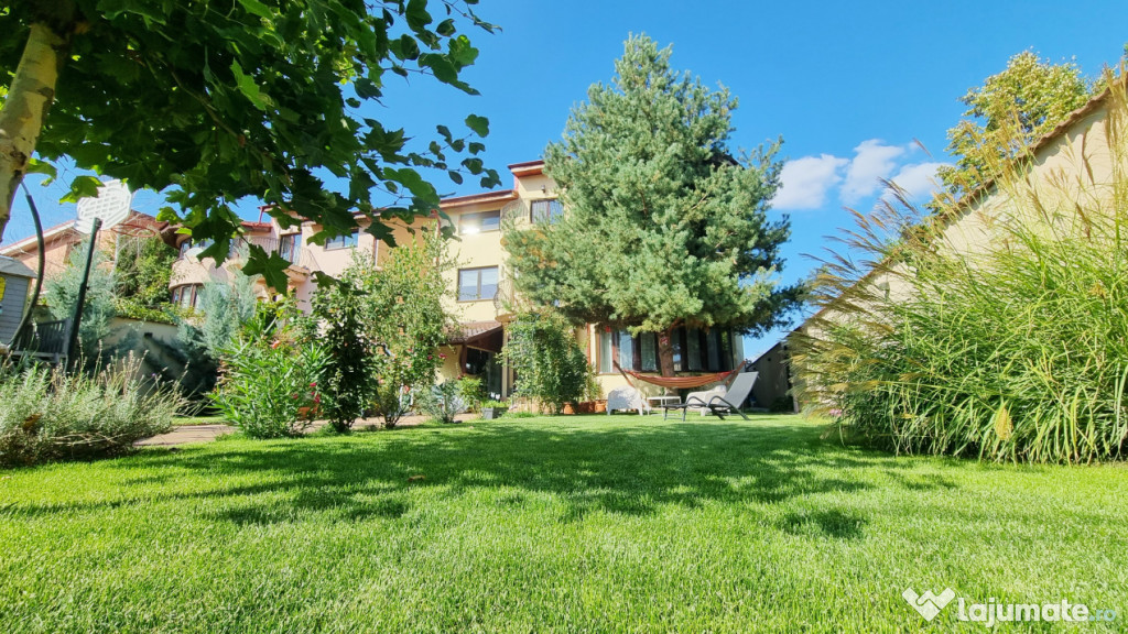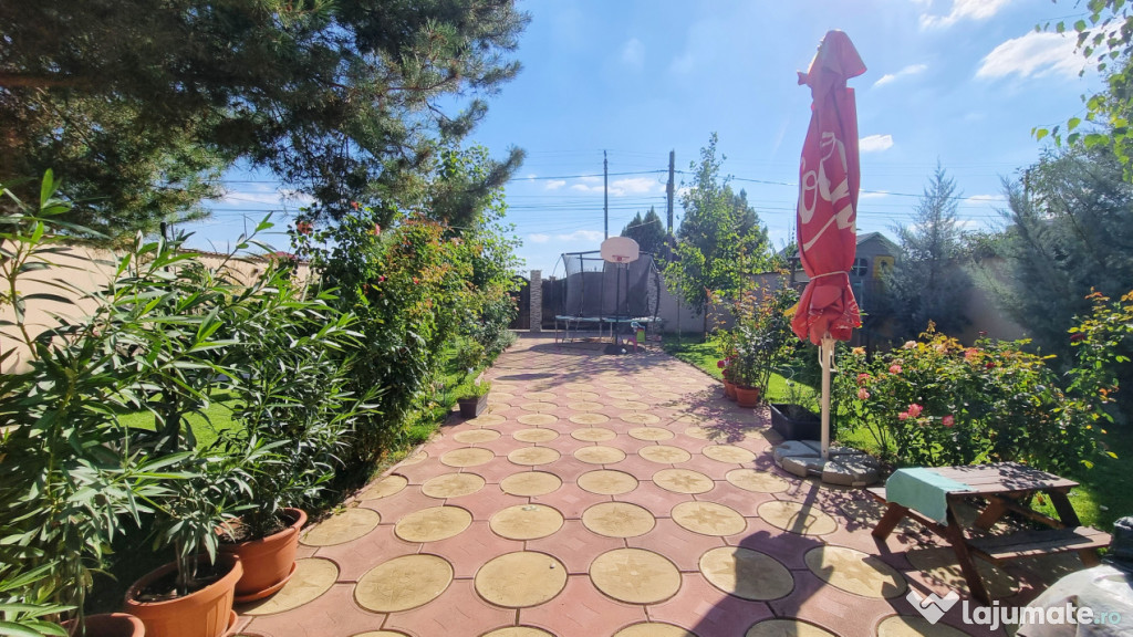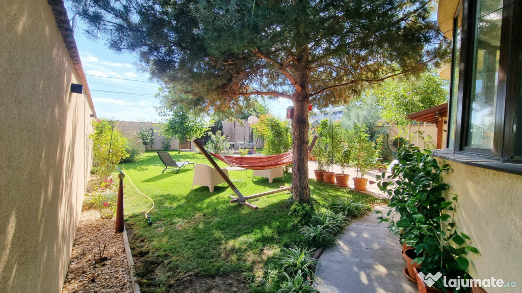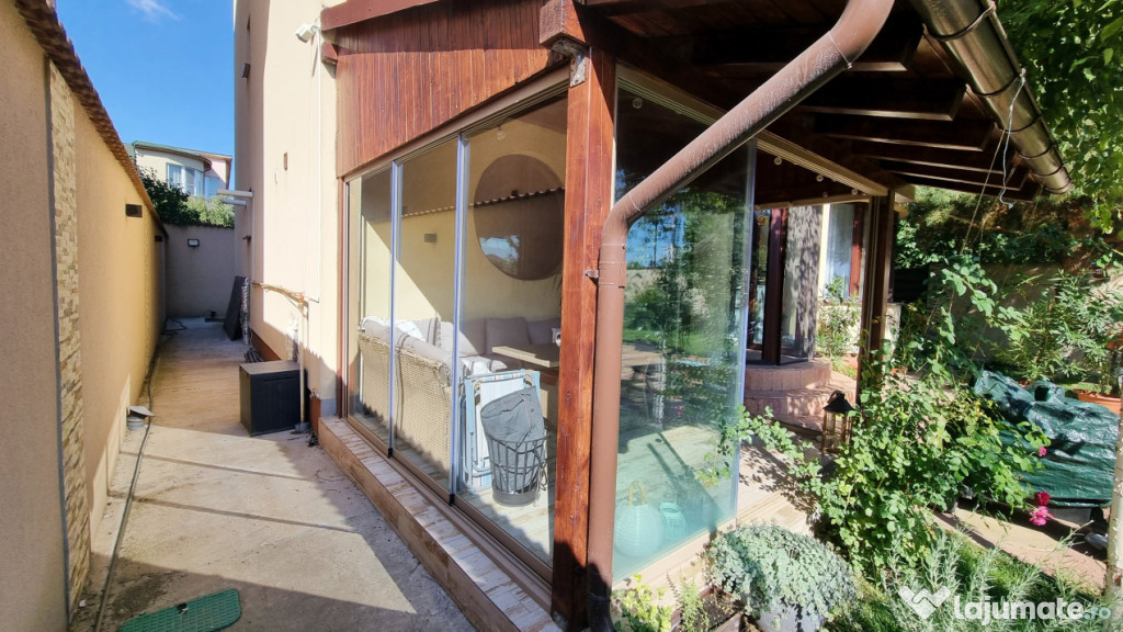 Curtea este amenajata cu gazon, pomi si plante ornamentale, sistem de irigatii atomat, alee pavata si o terasa inchisa cu geamuri de sticla glisanta.