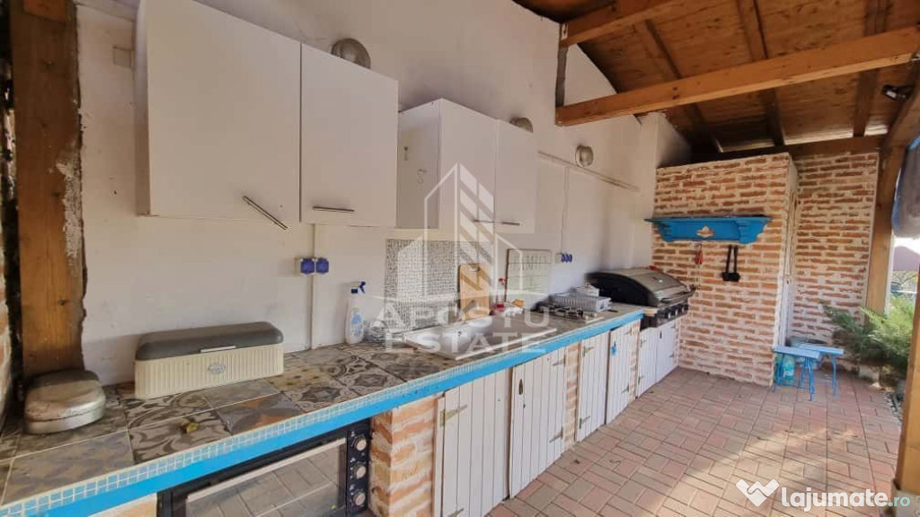 Curtea dispune de 4 locuri de parcare, carport, 2 terase, o bucatarie de vara si 2 anexe pentru spatiu de depozitare.