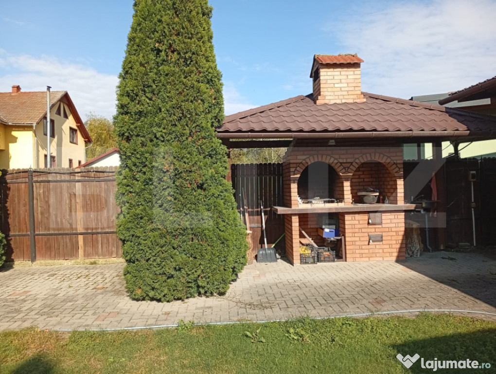 In curtea din spate gasim liniste, un foisor, in gratar din caramida numai bun sa prajiti fripturile pentru meciurile cu Romania.