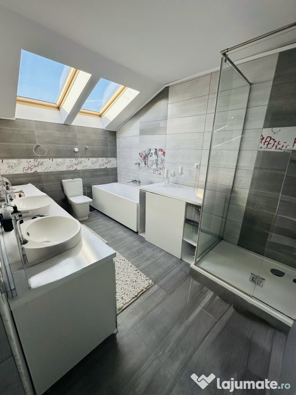 • 2 băi (una mare sus – 11 m², una de serviciu jos)