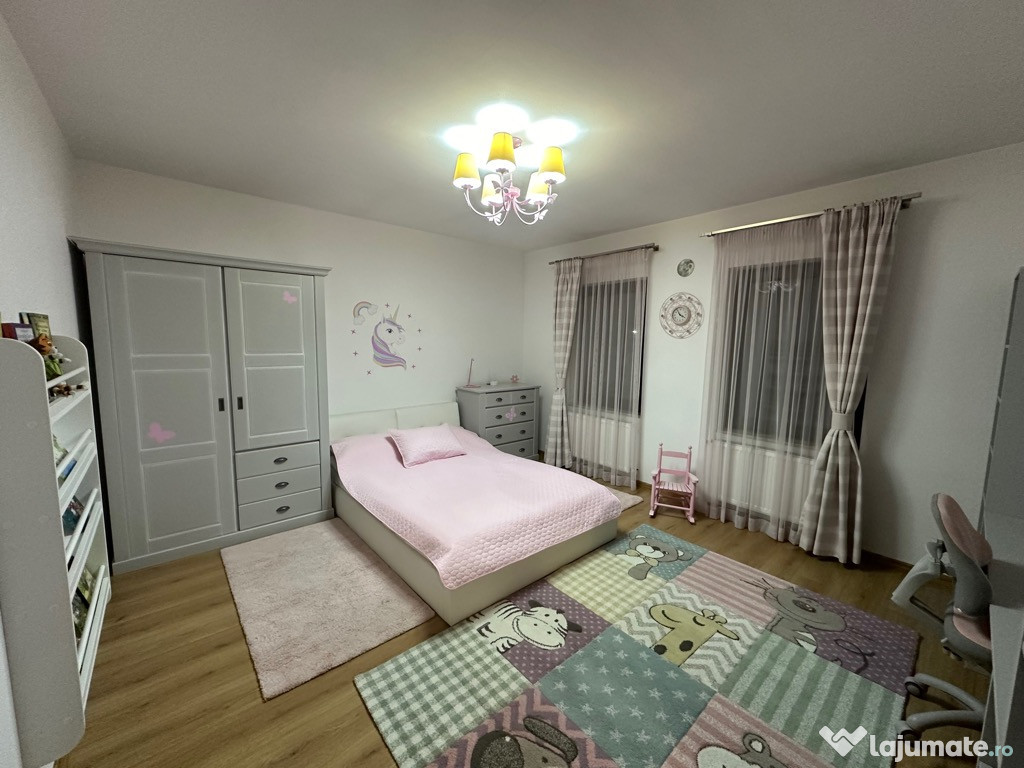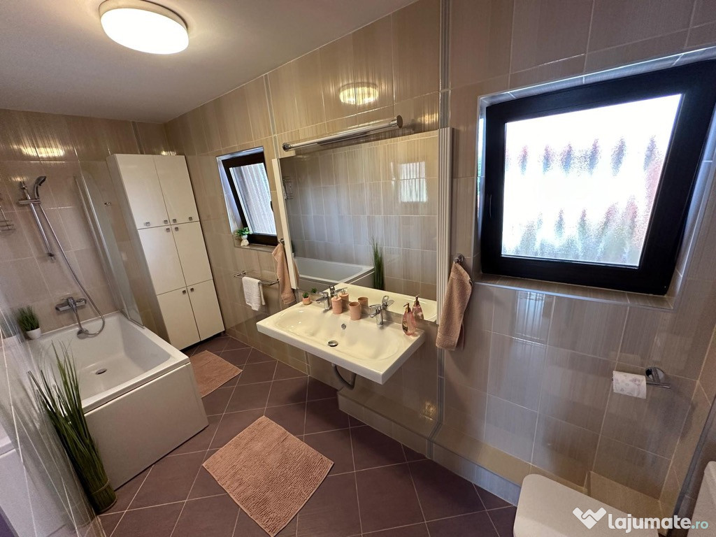 Etaj- 3 dormitoare din care 2 cu balcon, hol, o baie spatioasa.