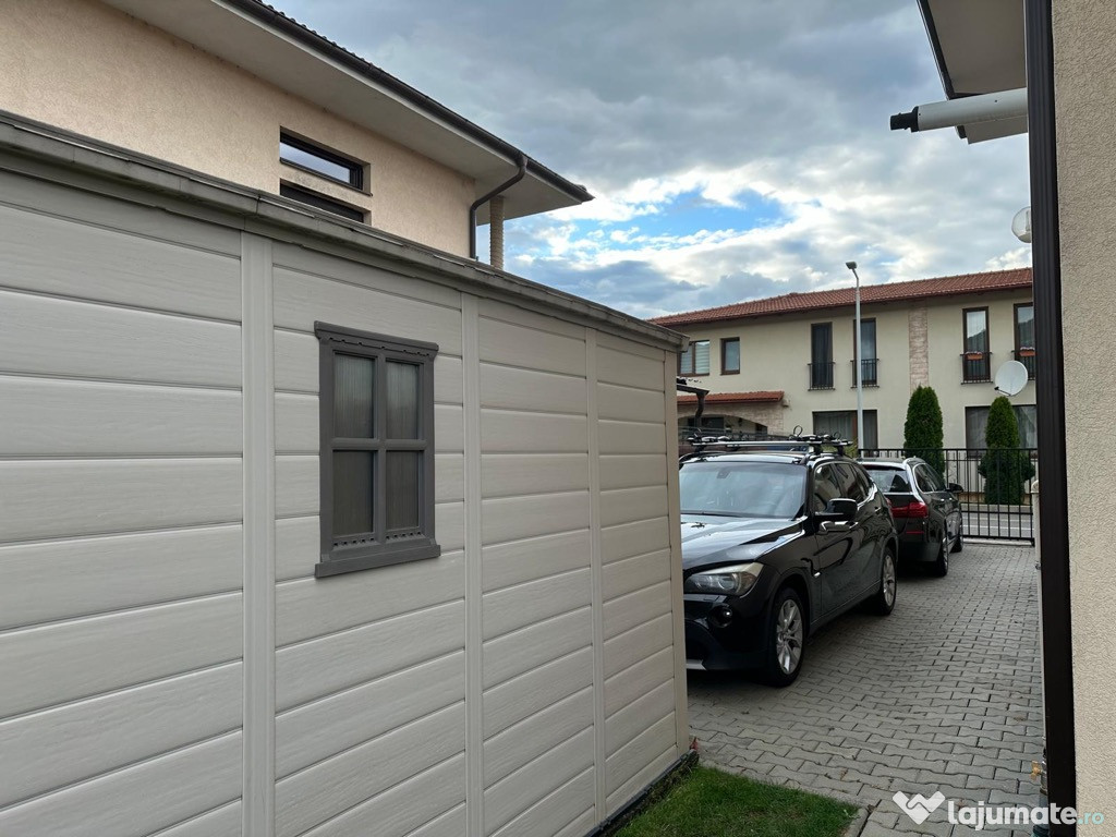 Curtea amenajata cu gazon si pavaj si o casuta de depozitare. Acces auto in curte pentru 2 masini.
