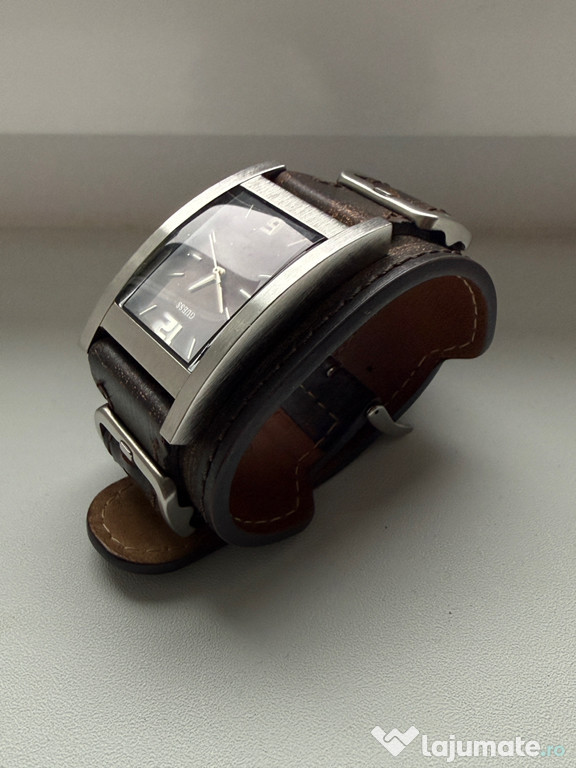 Vând ceas masculin Guess avand curea maro din piele cu sistem de prindere cu cataramă.Carcasă argintie din oțel inoxidabil cu geam din cristal mineral, mecanism Quartz