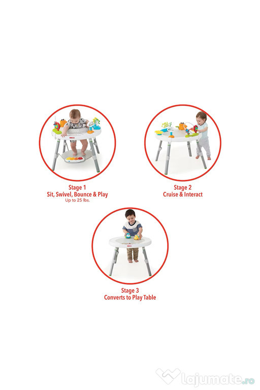 Jucăriile pot fi poziționate in diferite modalități, astfel că cel mic va fi mereu surpins.• Scaunul rotativ la 360 de grade oferă celor mici accesibilitate totală, la toate zonele centrului.