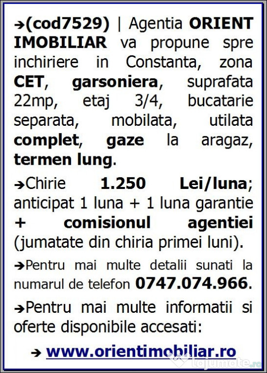 (cod7529) | Agentia ORIENT IMOBILIAR va propune spre inchiriere in Constanta, zona CET, garsoniera, suprafata 22mp, etaj 3/4, bucatarie separata, mobilata, utilata complet, gaze la aragaz, termen lung.Chirie 1.250 Lei/luna; anticipat 1 luna + 1 luna garantie + comisionul agentiei (jumatate din chiria primei luni).