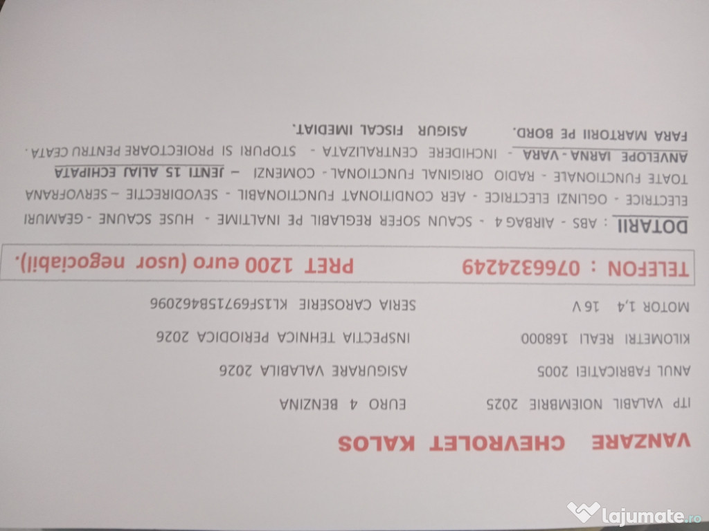 vezi in poze mai multe detalii despre autoturism. 168000 km reali ,euro 4, benzina asigurare și ITP valabile noiembrie 2026 funcționează impecabil preț ușor negociabil.Anuntul Chevrolet kalos 2005 este adaugat de pe LaJumate.ro.