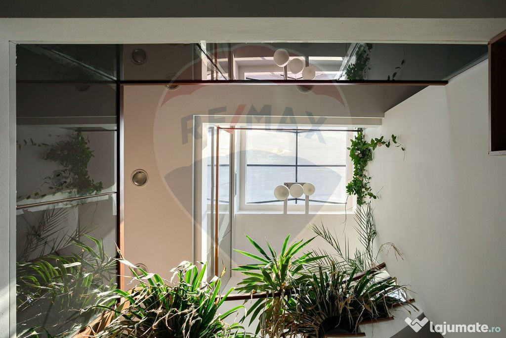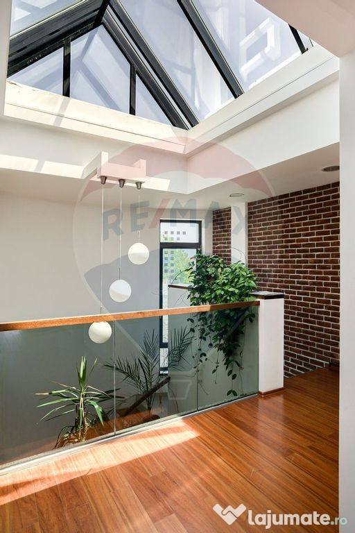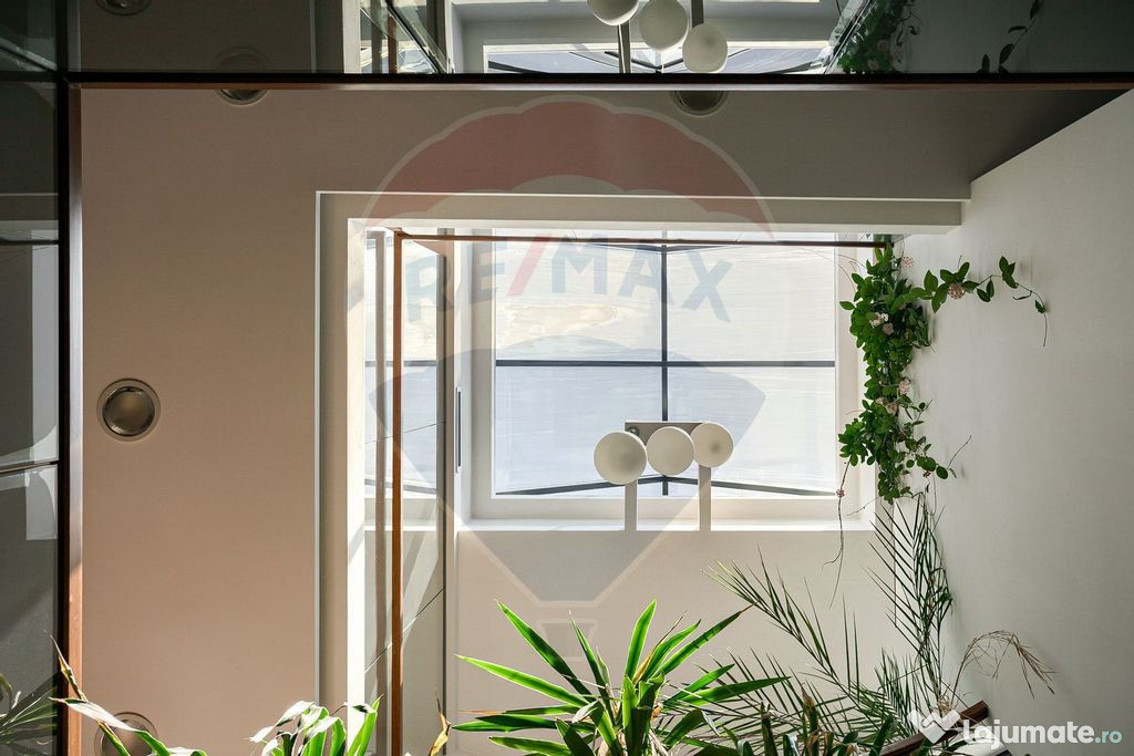 - Fațadă integrală din sticlă – lumină naturală excelentă
