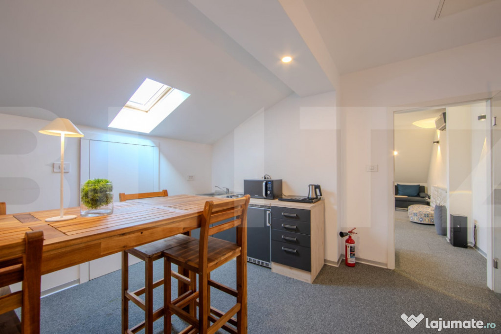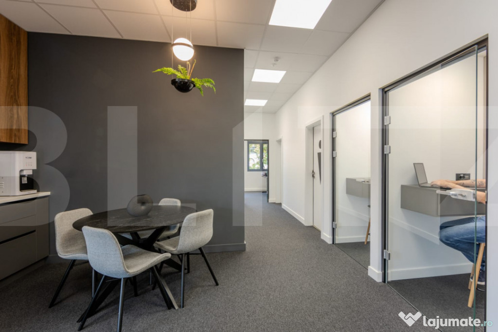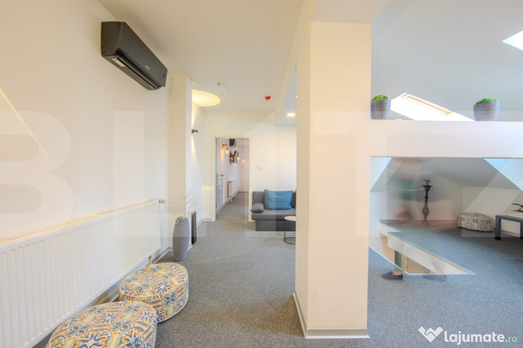 Compartimentare flexibilă – birouri individuale sau open space. Mansarda poate fi utilizată ca zonă de relaxare, coffee corner sau sală de mese.