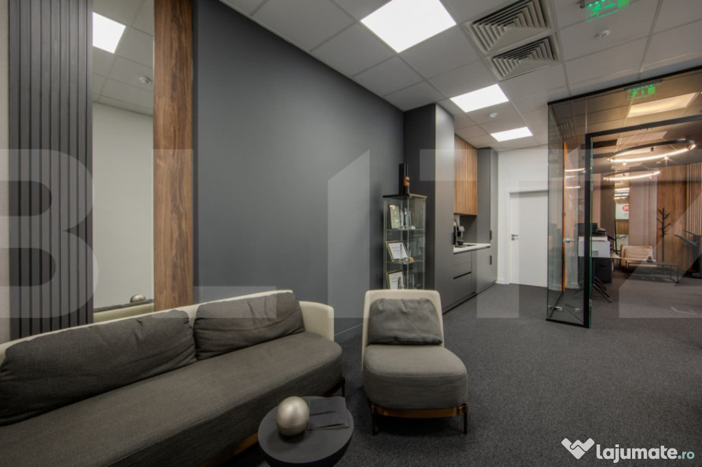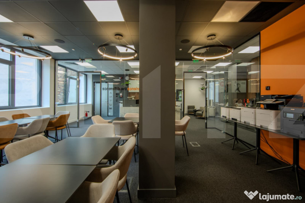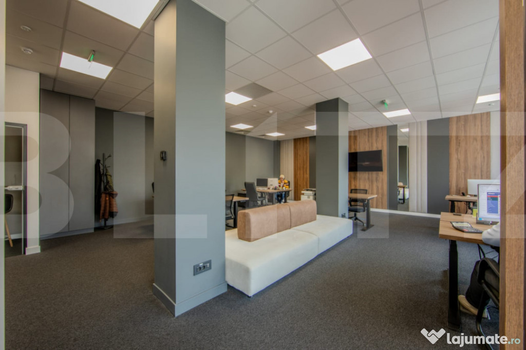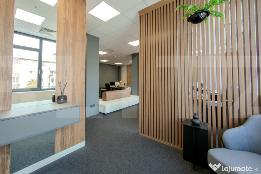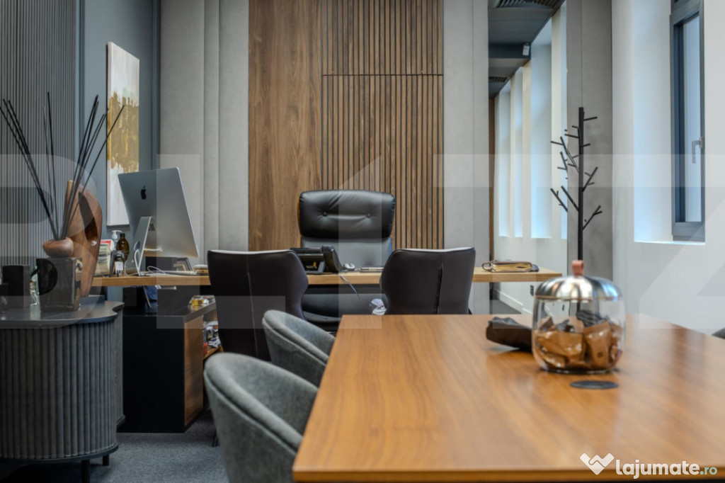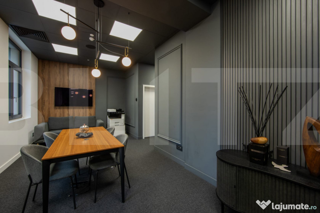 Spațiu de birouri clasa A, complet renovat și echipat modern, situat în Piața Victoriei – una dintre cele mai prestigioase locații din Timișoara.Clădirea dispune de ~600 mp utili (4 etaje x 130 mp + mansardă 80 mp), finisaje premium, mobilier parțial inclus și infrastructură completă IT, control acces, camere video, climatizare VRV Daikin și iluminat inteligent.