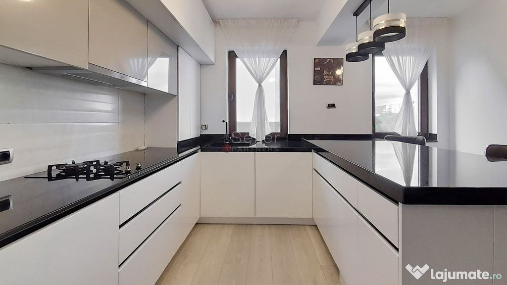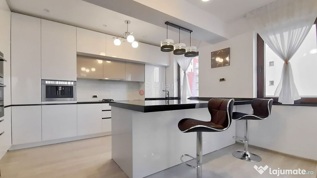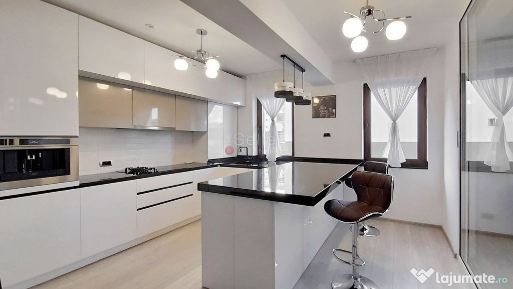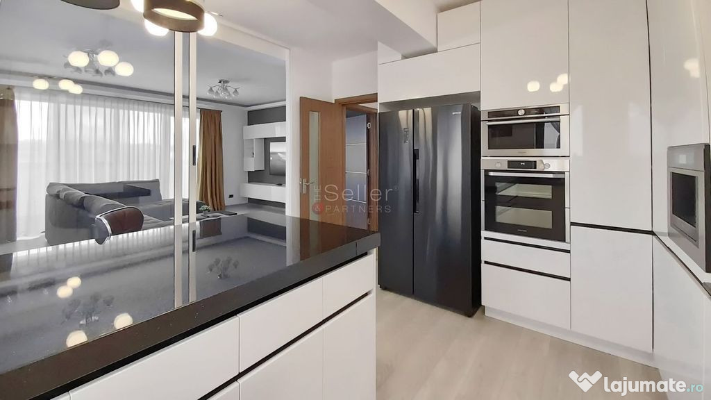 - Bucataria este complet mobilata si utilata, detine finisaje de foarte buna calitate, se poate utiliza inchisa sau deschisa, datorita peretelui de sticla care face trecerea catre living avand finisaje moderne si calitative.