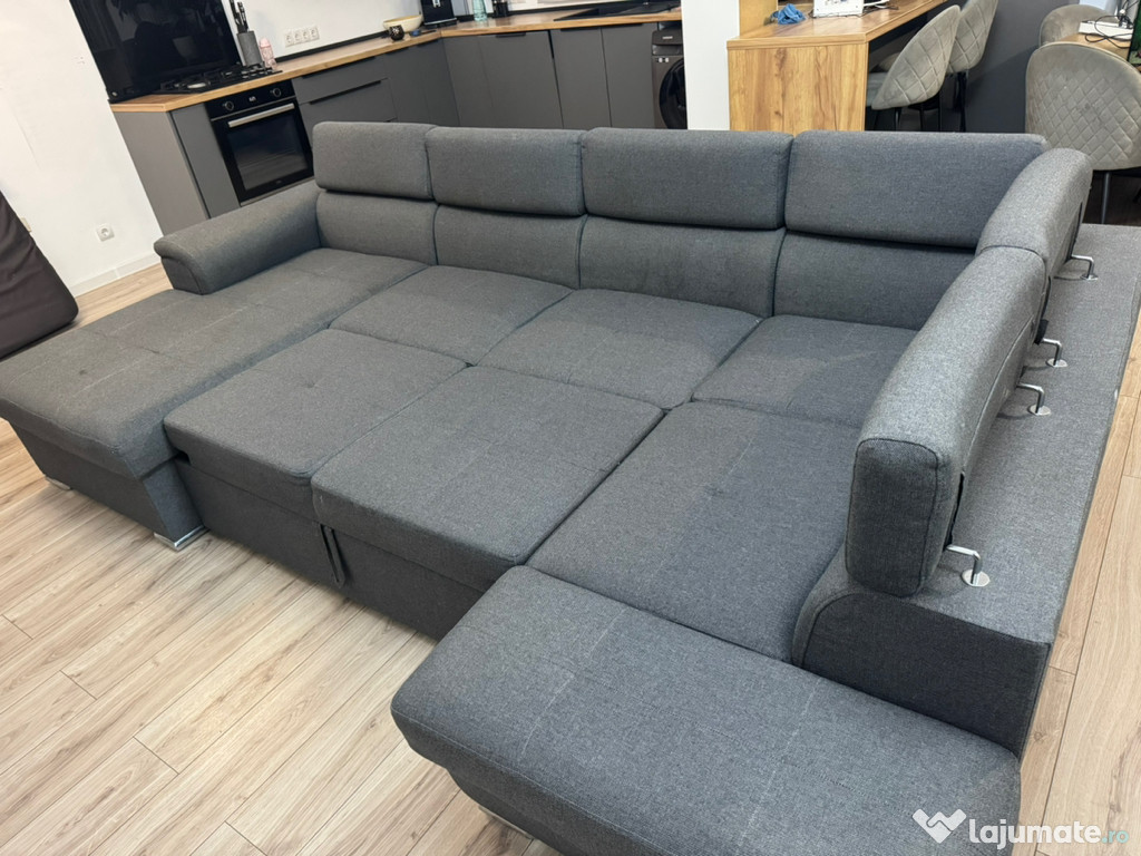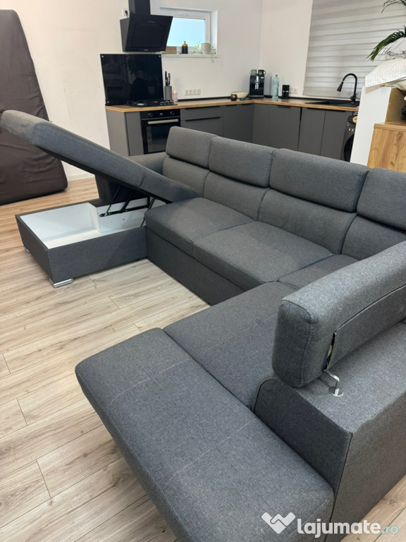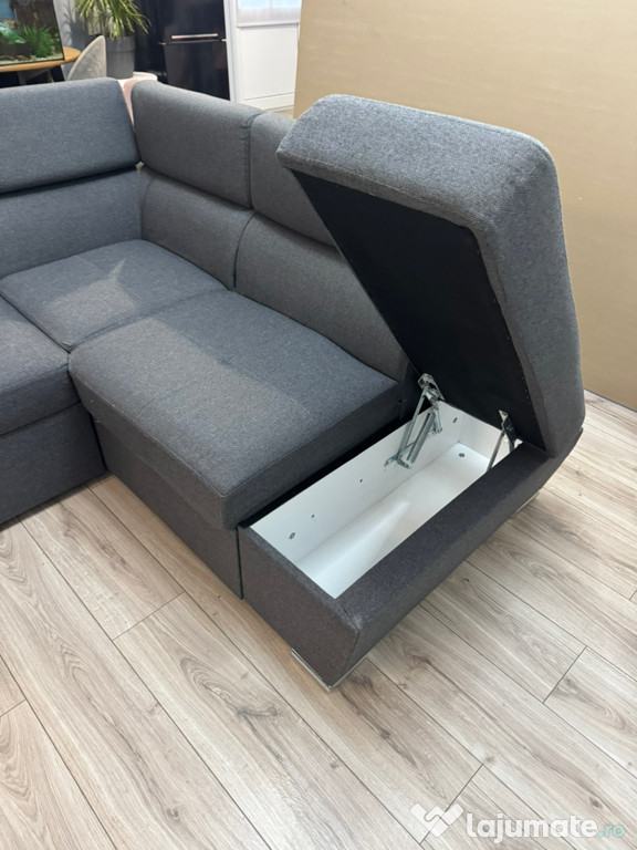Vand canapea extensibila, 3 locuri cu lada depozitare, culoare gri deschis. Materialul este stofa rez ...