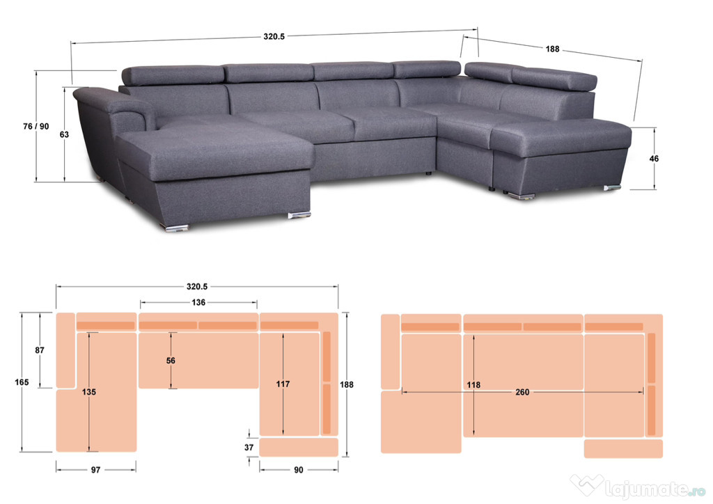 Coltar in forma de U Medisan Dimensiuni: - L320.5 B188 H76/90 сm - suprafata de dormit: 118/260 сm Ma ...