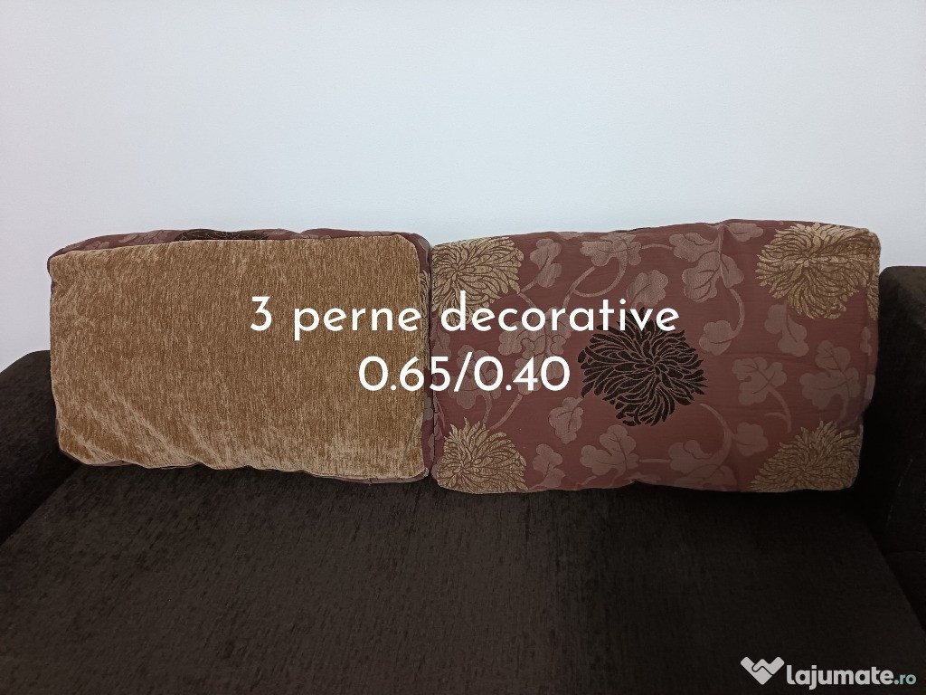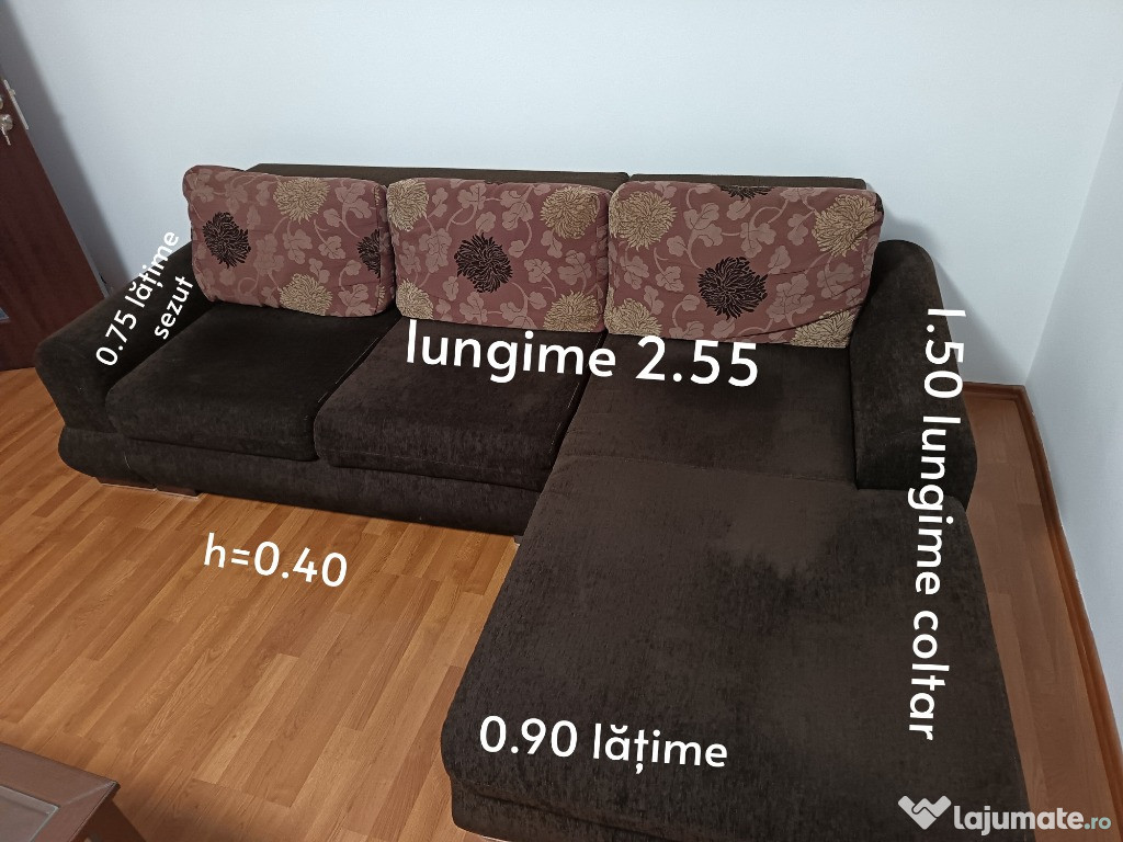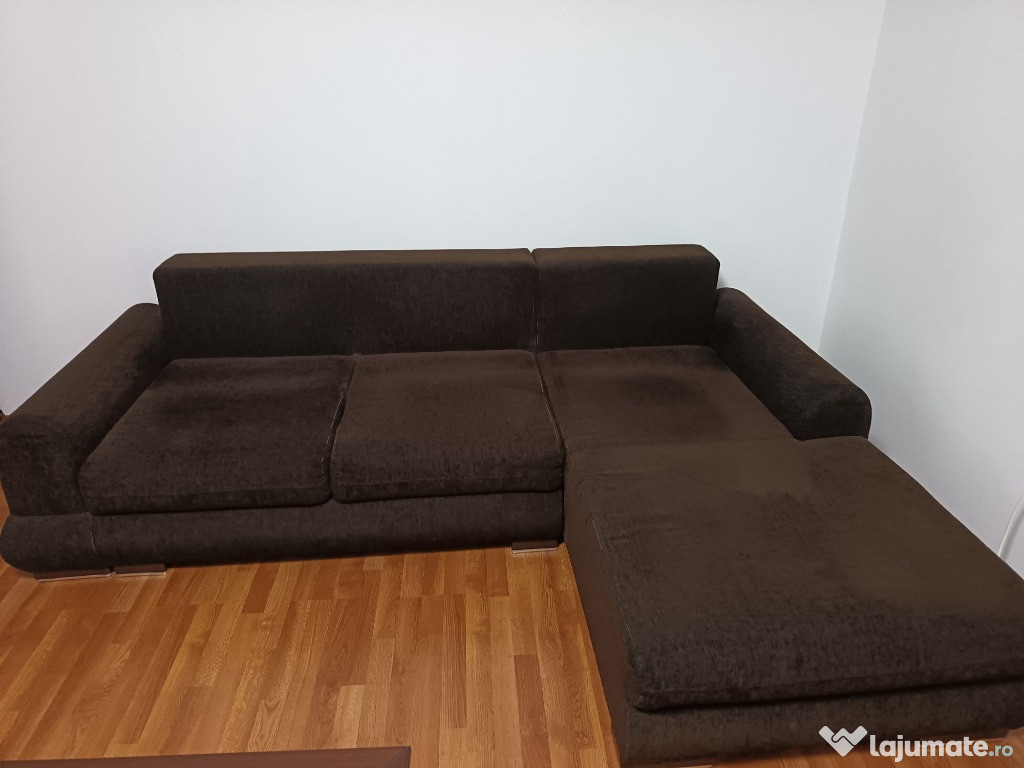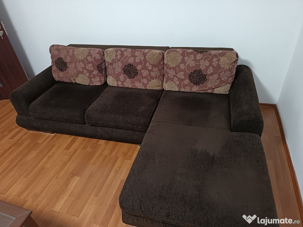 Canapea de colț extensibilă cu 3 locuri, în culori închise. Tapițeria este în nuanțe de maro cu 3 perne cu flori decorative. Piesa de mobilier este în stare foarte buna de utilizare, fara urme de uzură. Potrivită pentru amenajarea unui living sau a unui spațiu de relaxare.Foarte putin utilizata, are lada de depozitare, cadru din lemn masiv.