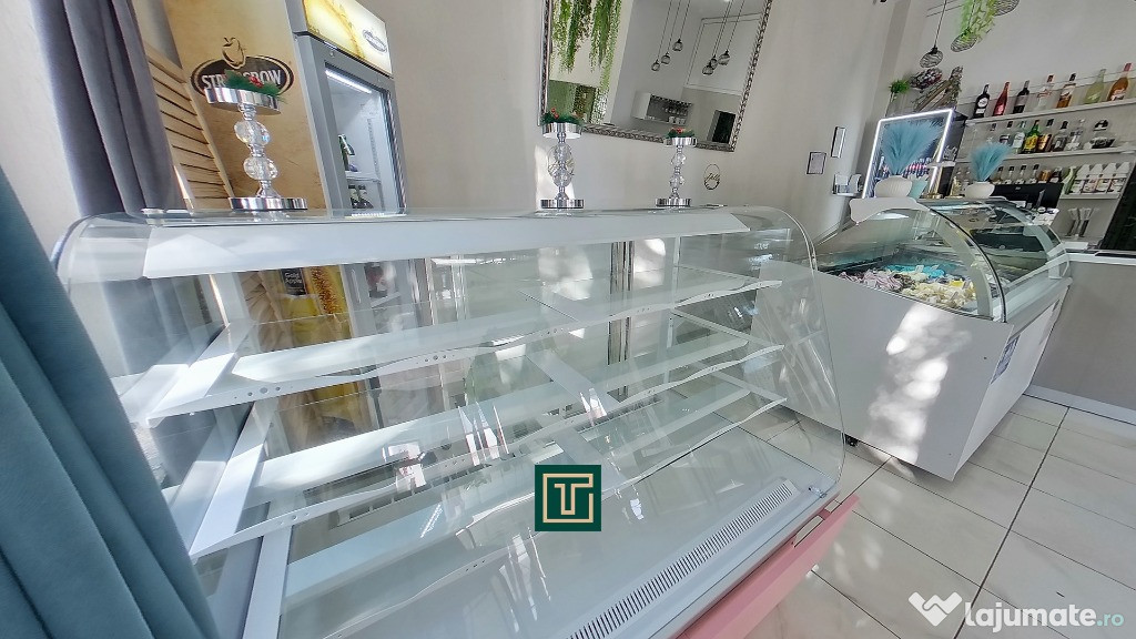 2 vitrine frigorifice (una la -20°C pentru înghețată, una între 0–4°C pentru prăjituri)
