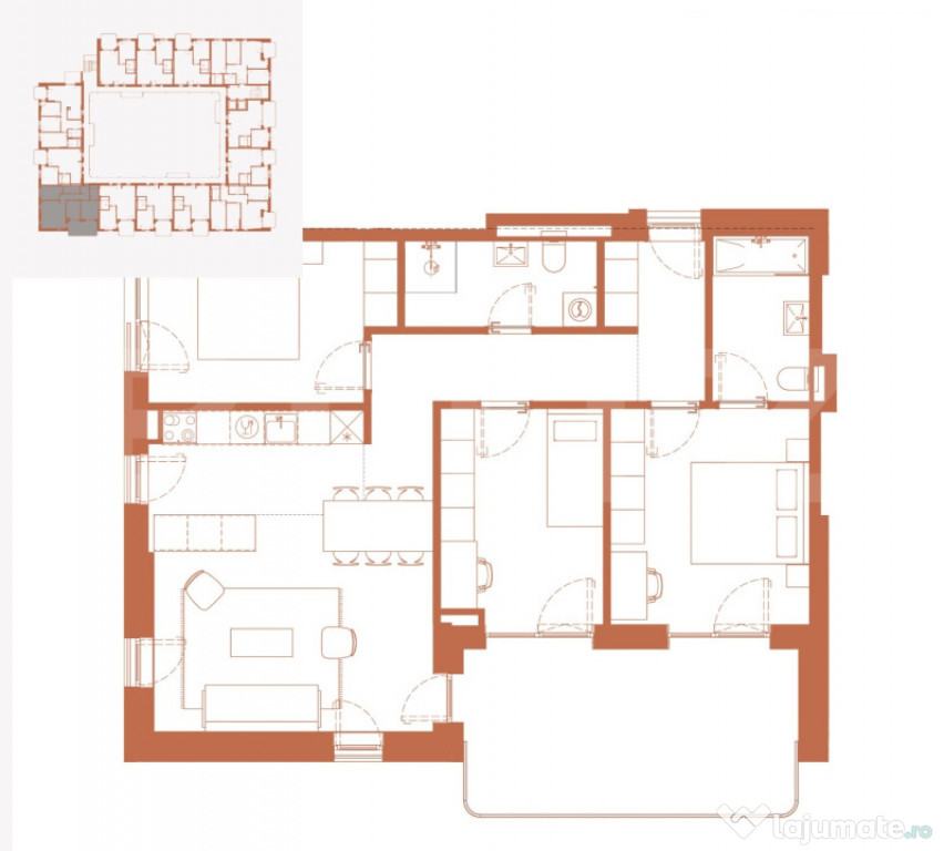 Apartamentul prezentat are o suprafata utila de 86.2 mp plus un balcon de 18.1 mp. Pretul afisat este valabil pentru plata unui avans de 30%. Pentru plata unui avans mai mare pretul este negociabil. Pretul parcarilor subterane este de 12.500 plus TVA