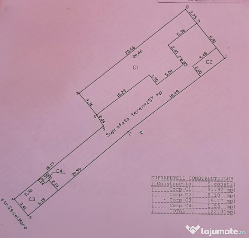 Suprafata totala teren 257 mp, deschidere stradala de 3,41 metri (garaj 19.77 MP), iar latura din spate 9,56 mteri. Constructia este din caramida/boltari si este compusa din 3 camere, bucatarie, baie cu aerisire cu geam, hol. Al doilea corp de cladire reprezinta o bucatarie de vara si camara. Centrala termica pe gaz, tamplarie exterior-interior PVC, pereti izolati termic, faianta, gresie, parchet. Foarte bine intretinuta!