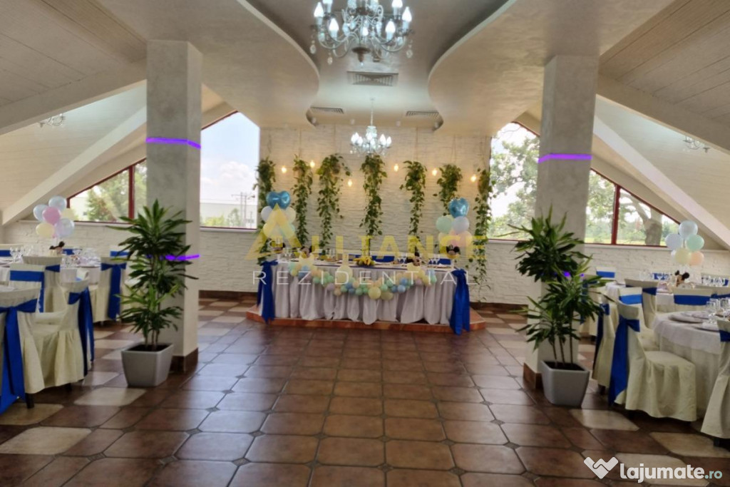 Complexul turistic isi desfasoara activitatea pe un teren de 20000 mp, proprietatea este compusa din restaurant principal a la carte, loc in care se mai regaseste un bar si receptia ce deserveste cazarea. Salonul a la carte este folosit si pentru evenimente avand o capacitate de 80 locuri, dotat cu 6 bai pentru clienti, vestiare personal, bucatarie proprie, spatii depozitare, servere, instalatie climatizare, instalatie prevenire incediu. Mai exista un salon la etaj cu o capacitate de 120 locuri, dotat cu 6 bai clienti, climatizare, instalatie prevenire incendiu. Pe langa saloanele restaurantului complexul mai detine un hostel P 1) cu camere de 3 stele, cu o capacitate de 42 locuri, un salon de evenimente la parter cu o capacitate de 80 persoane, 2 vile p 1 cu o capacitate de 8 locuri fiecare, 8 bungalow-uri cu o capacitate de 16 locuri, 6 bungalow-uri cu o capacitate de 12 persoane, 2 terenuri de tenis pe zgura, spatii de joaca pentru copii, terasa partial acoperita cu o frumoasa fantana arteziana in mijloc cu o capacitate de 60 locuri, parcare proprie supravegheata. In toate cladirile exista climatizare asigurata prin pompe de caldura cu aport cald sau rece sau aer conditionat. Totodata complexul dispune de televiziune prin cablu, internet, wi fi. Pret 3.000.000 euroTelefon ascuns