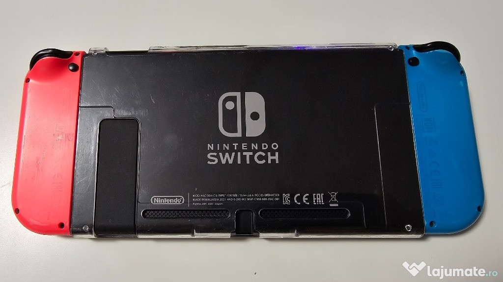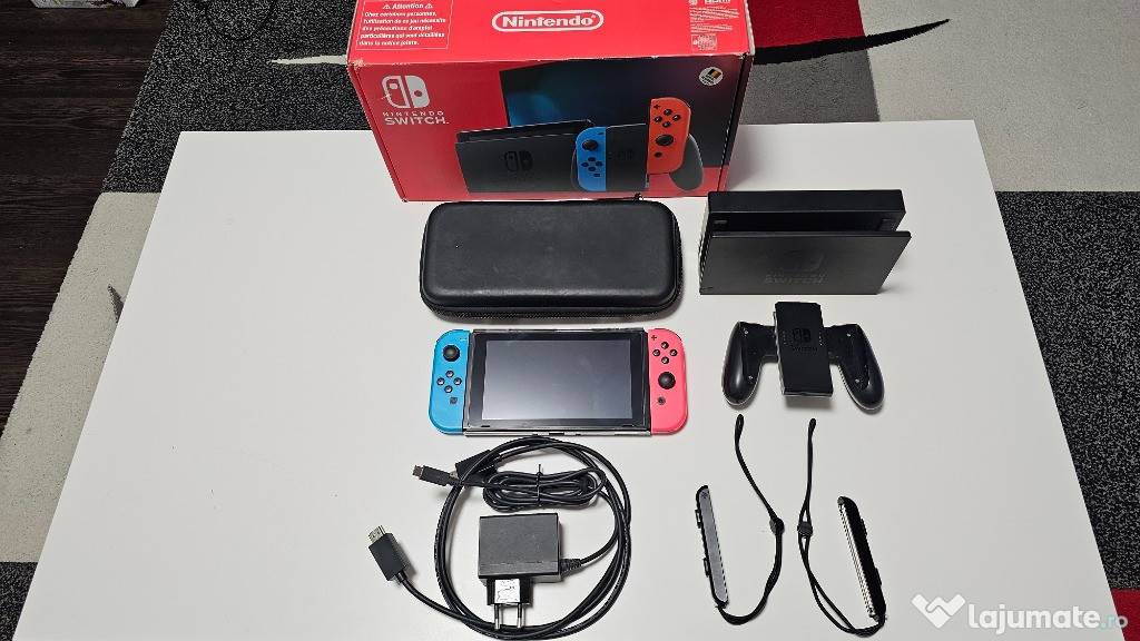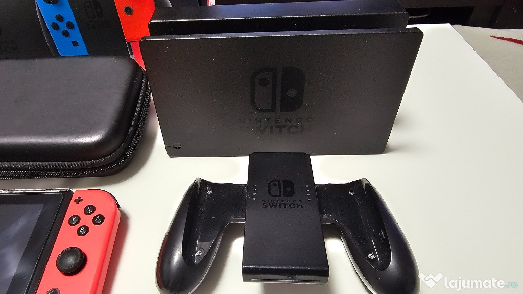 Vand o consola Nintendo Switch in perfecta stare de functionare cu toate accesoriile incluse(vezi foto)+gentuta de transport cu lacasuri pt.cardurile de joc si un suport pliabil pt.consola pt.a juca de la distanta ca pe monitor/tv.Are semne de uzura in special pe joy-conul stanga albastru,dar functioneaza perfect.