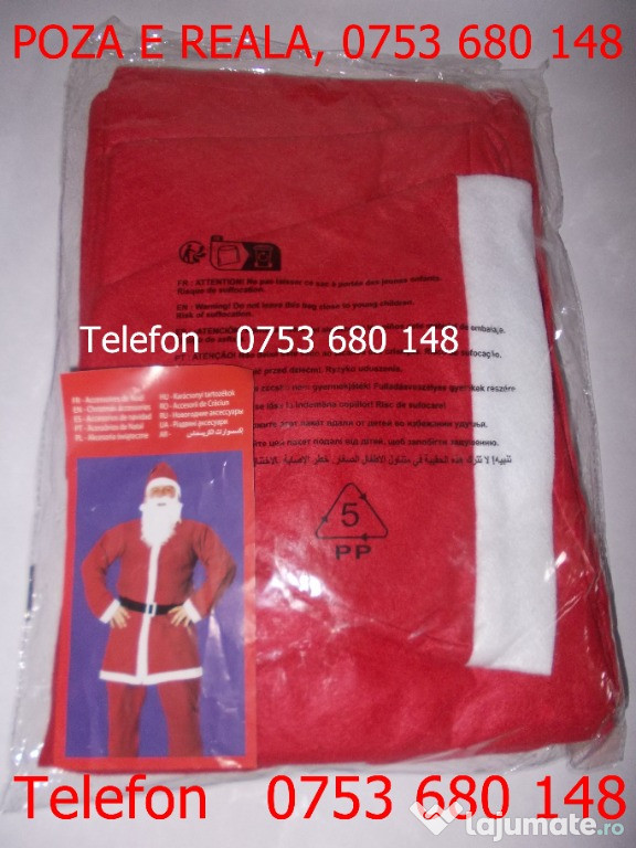 Anuntul e valabil, va rugam telefonați la zero sapte 53 680 unu patru opt, vindem la Bucuresti, nu expediem in alte localitati, costume noi Mos Craciun pentru adulți, modelul de costum din POZELE REALIZATE DE NOI, LA PRET REAL SI FIX 29 Lei pachetul nou sigilat, cu: barba si mustata, pantaloni lungi, haina, caciula, curea, pentru persoane cu greutate mare supraponderale, cu greutate medie sau suple, marime: XXL, XL, L, M, S.Pentru ca nu citim mesajele trimise de pe acest sait, va rugam telefonați la zero sapte 53 680 unu patru opt, in orice zi de luni pana duminica inclusiv duminica de la ora 7 jumate dimineata la 10 jumate seara.