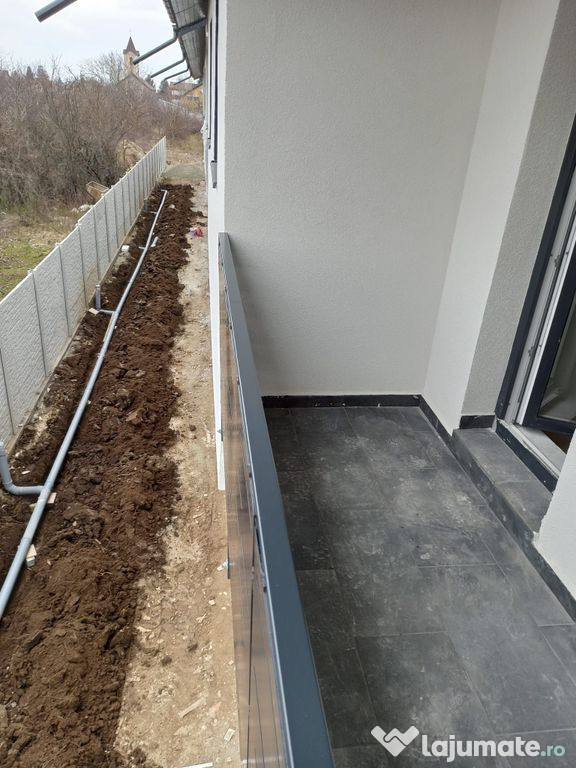 Curtea se poate preda amenajata(doar la cerere, contra cost), avand alee de beton pe langa casa cu latimea de 80cm.