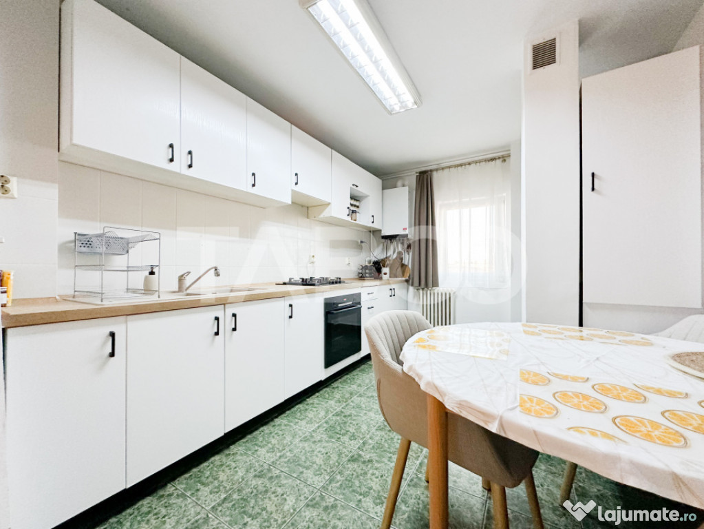 Apartamentul se vinde mobilat si utilat cu: aragaz, cuptor, hota, masina de spalat rufe, frigider cu congelator.