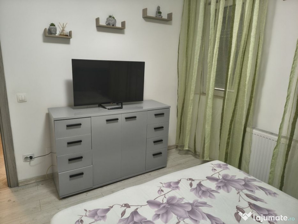 garsonieră dubla in Popești Leordeni aproape de metrou Leonida (7-10 min);Dormitor cu un pat mare 1600x2000 , dresing , comoda și tv