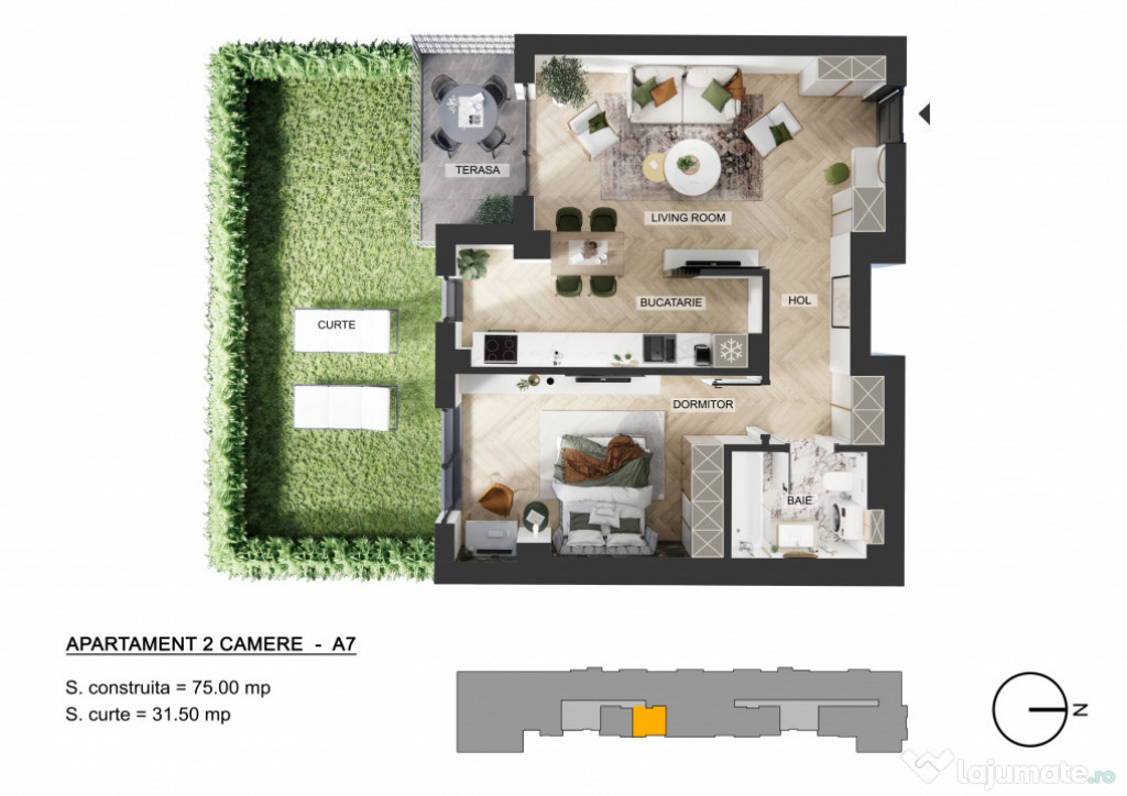 ???? Proprietatea are o suprafață generoasă de 75 mp, compartimentați inteligent pentru a oferi spații aerisite și luminoase. Livingul spațios se deschide către o terasa de 5.4 mp si o grădină privată de 31,5 mp, ideală pentru relaxare, seri liniștite în aer liber sau pentru amenajarea unui colț verde personalizat.