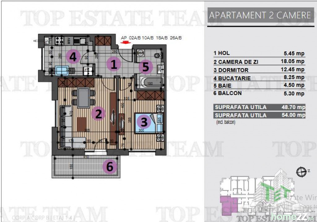 Apartament 2 camere cu suprafata utila de 48.70 mp si suprafata totala de 54 mp.