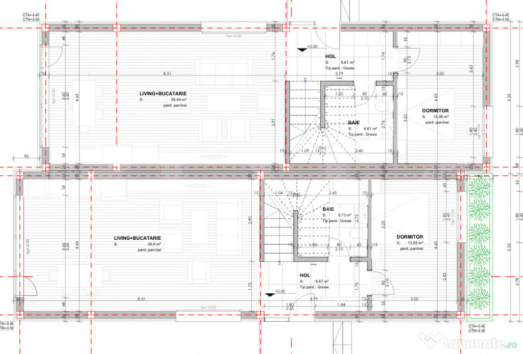 Parter: living cu bucătărie open-space de 38 mp, dormitor, baie și hol.