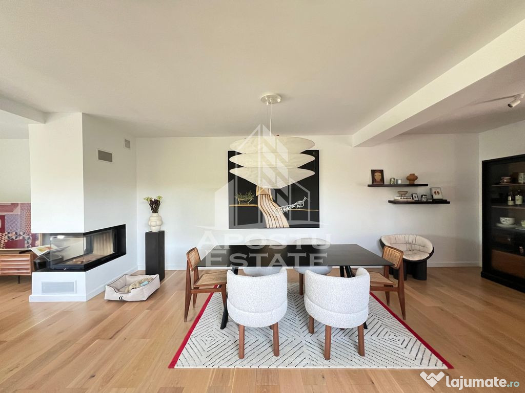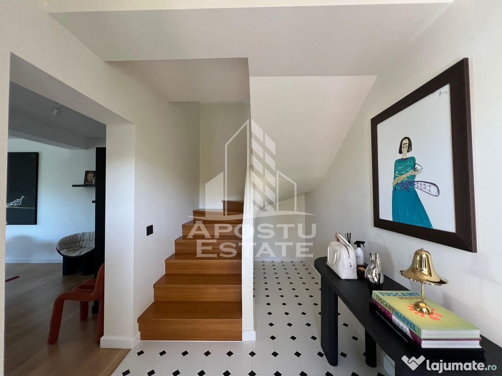 Apostu Estate va prezinta un duplex de lux situat in Dumbravita, intr-o zona exclusivista si linistita, in imediata apropiere a Parcului Terra. Proprietatea impresioneaza prin suprafata generoasa, finisaje de top si design interior elegant, fiind alegerea ideala pentru cei care apreciaza confortul si rafinamentul.Casa are o suprafata utila de 140 mp si este construita pe un teren de 432 mp, oferind un echilibru perfect intre spatiu interior si exterior.