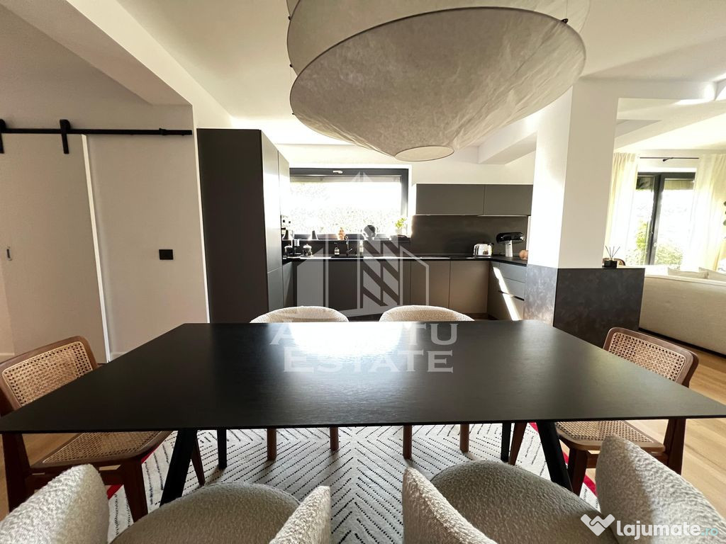 Duplexul este mobilat si utilat complet, cu piese de mobilier si electrocasnice premium, oferind un ambient rafinat, gata de locuit. Finisajele sunt realizate cu materiale de cea mai buna calitate, iar compartimentarea este excelenta, asigurand confort si functionalitate.