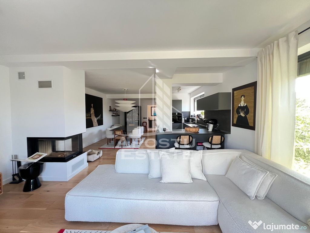 Proprietatea este compusa din 4 camere spatioase si luminoase, 2 bai complet echipate, dressing generos si 2 terase perfecte pentru relaxare in aer liber. Livingul amplu este dotat cu semineu functional, adaugand un plus de caldura si eleganta atmosferei.